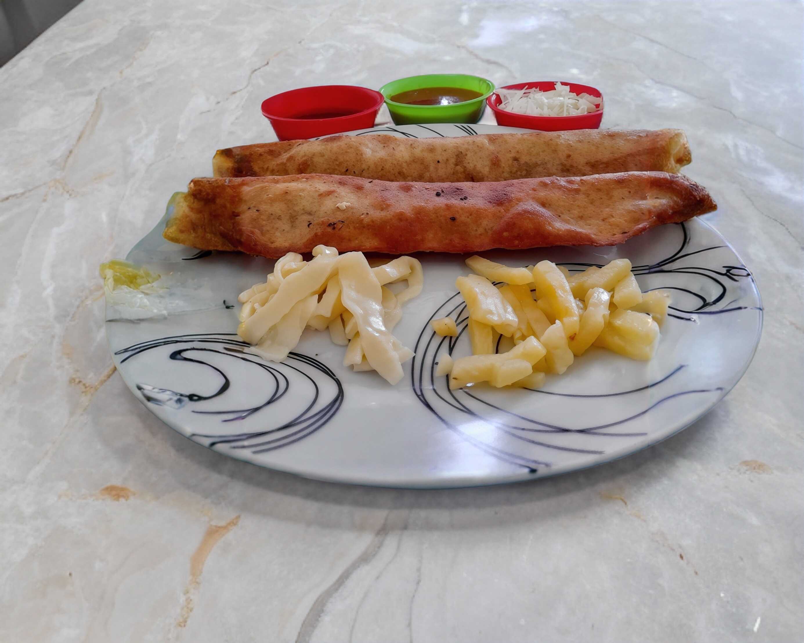 Empanadota 22 cm. Relleno de queso manchego, acompañado de salsa de tomate, salsa picante y repollo.