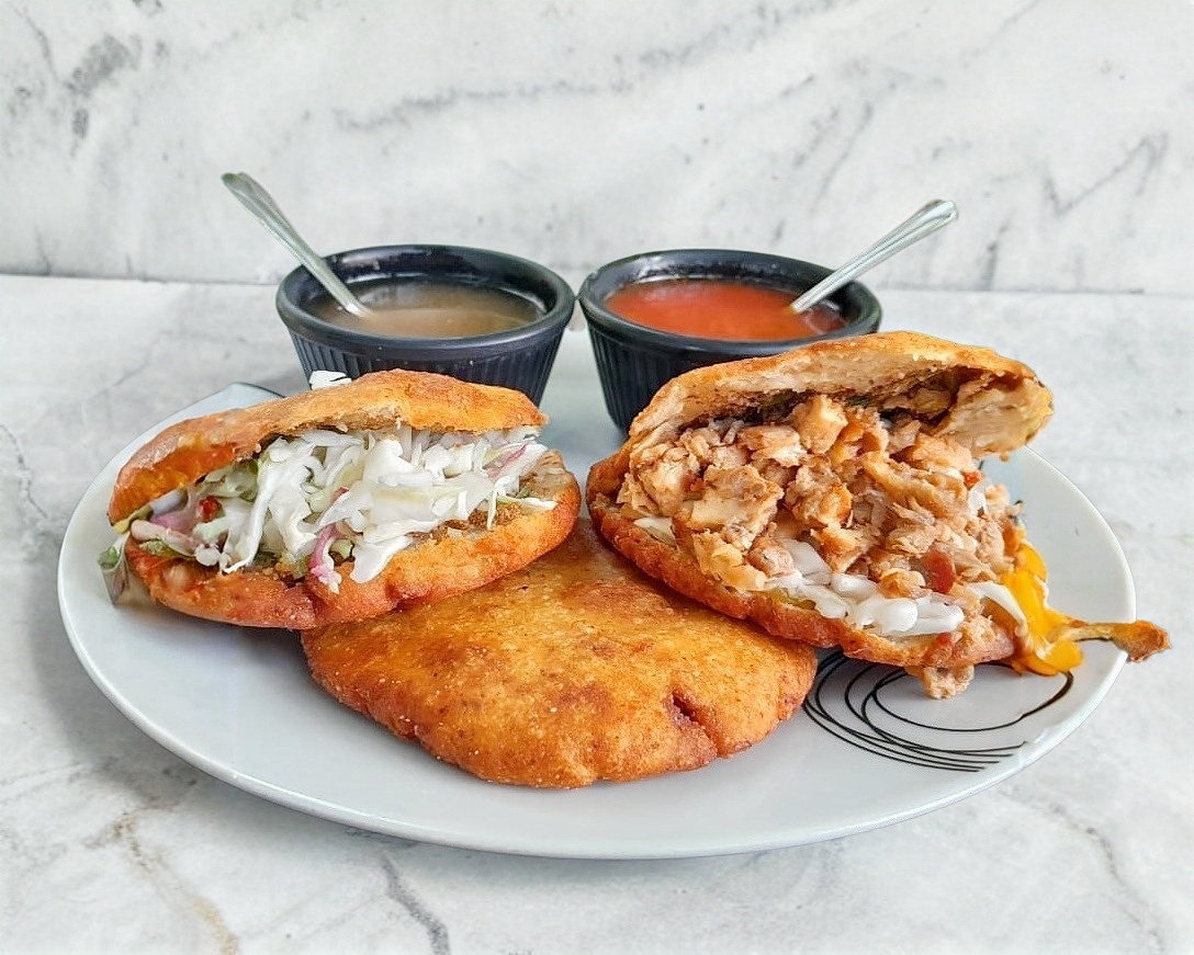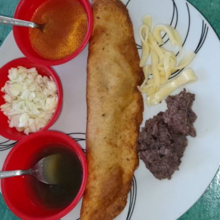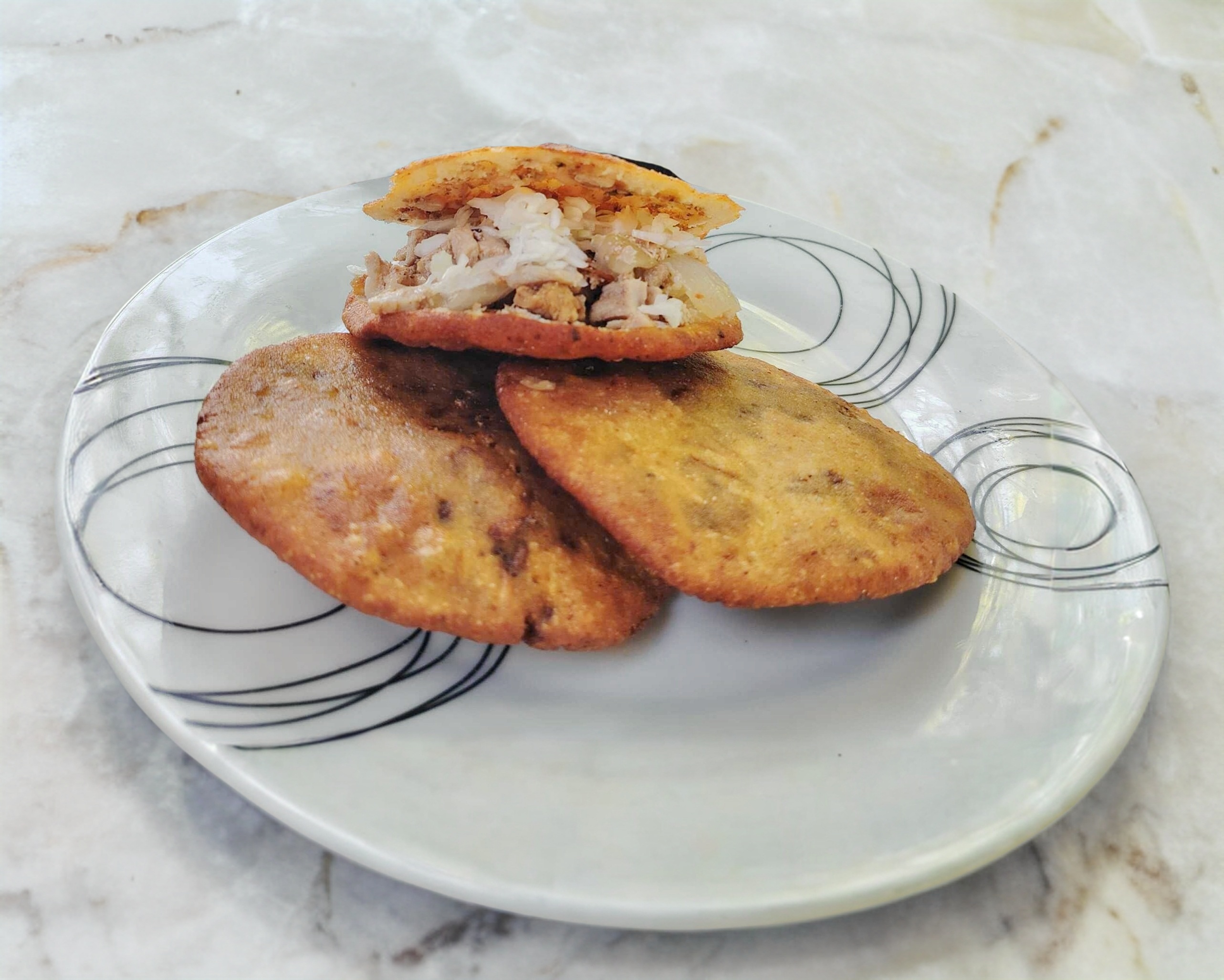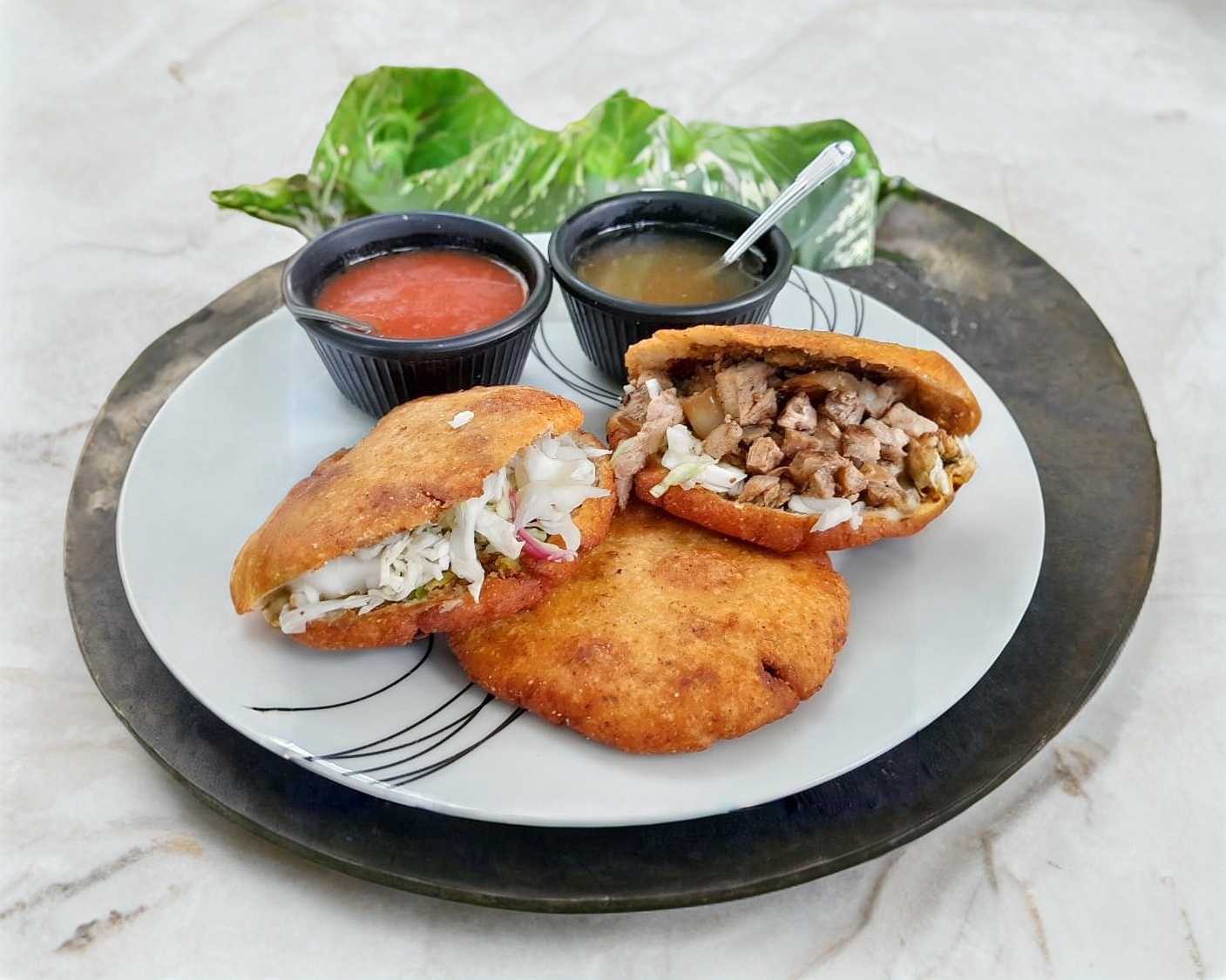 Polcan de maíz frito con relleno de carne asada y repollo, acompañado de salsa de tomate y picante.