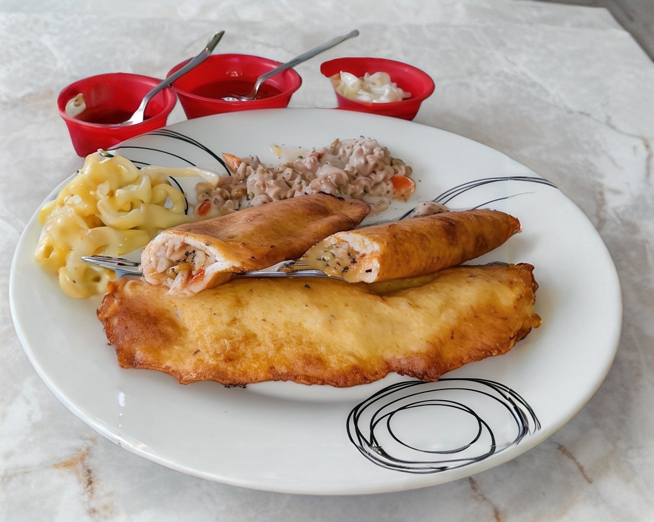 Empanadota 22 cm. Relleno de piña y queso, acompañado de salsa de tomate, salsa picante y repollo.