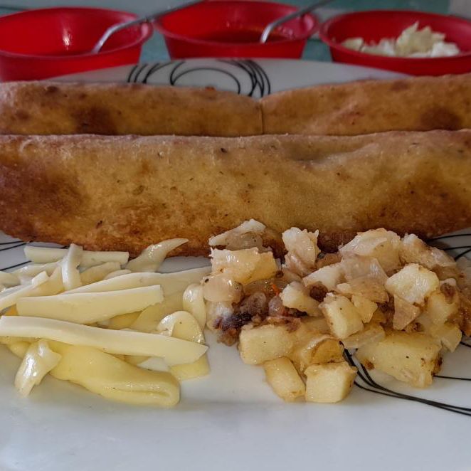Empanadota 22 cm. Relleno de papa con queso, acompañado de salsa de tomate, salsa picante y repollo.