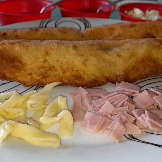 Empanadota 22 cm. Relleno de jamón y queso, acompañado de salsa de tomate, salsa picante y repollo.