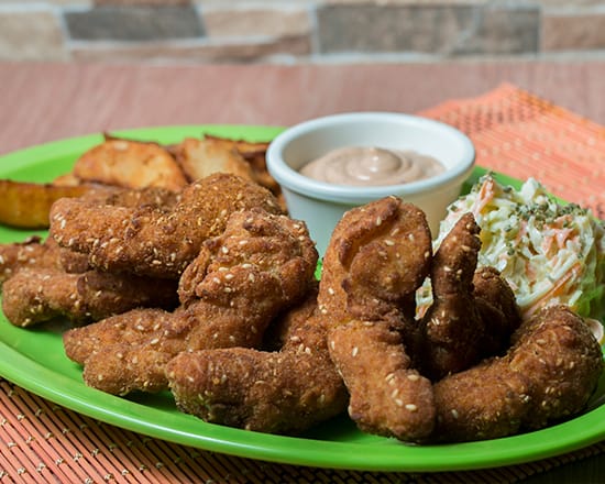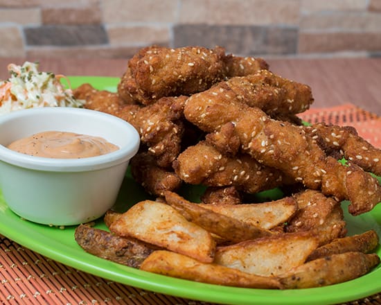 Tiras de pescado empanizado con un toque de ajonjolí y especias de la casa, acompañadas con papas gajo, ensalada col-slow y aderezo de chipotle.