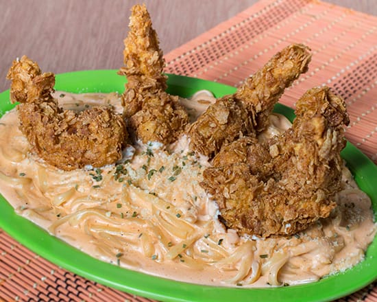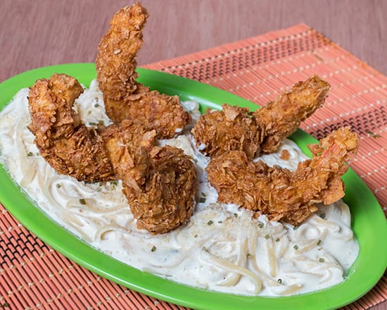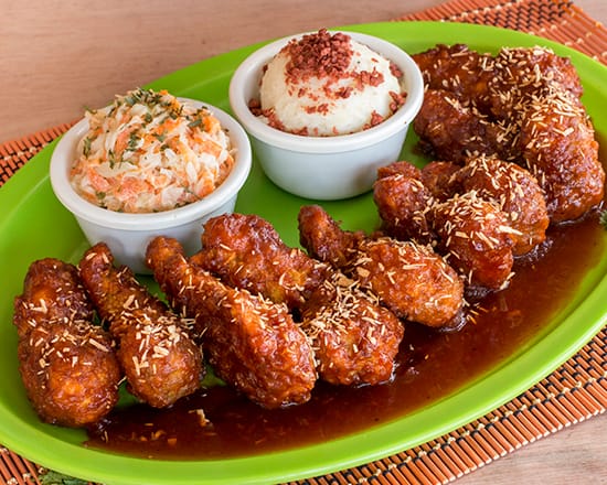 Deliciosos camarones empanizados cubiertos de una salsa BBQ de coco casera creación del Chef, acompañado de una porción de puré de papa y ensalada col-slow.