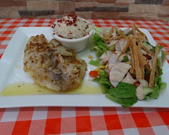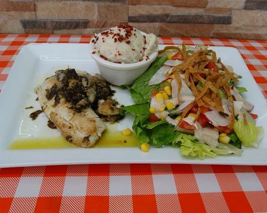 Filete a la plancha aderezado con nuestras salsa chimichurri casera, acompañada de una porción de puré de papa y ensalada de la casa.