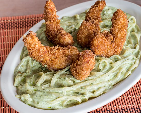 Pasta con salsa Alfredo adicionada de esta salsa italiana hecha con albahaca y el toque único del Chef, agrégale camarones o tiras crunchy para hacerlo único