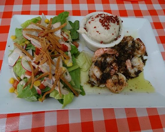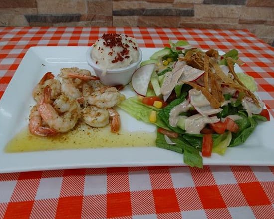 Camarones salteados con nuestro mojo de ajo al romero creación del chef, acompañado de una porción de puré de papa y ensalada de la casa.