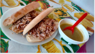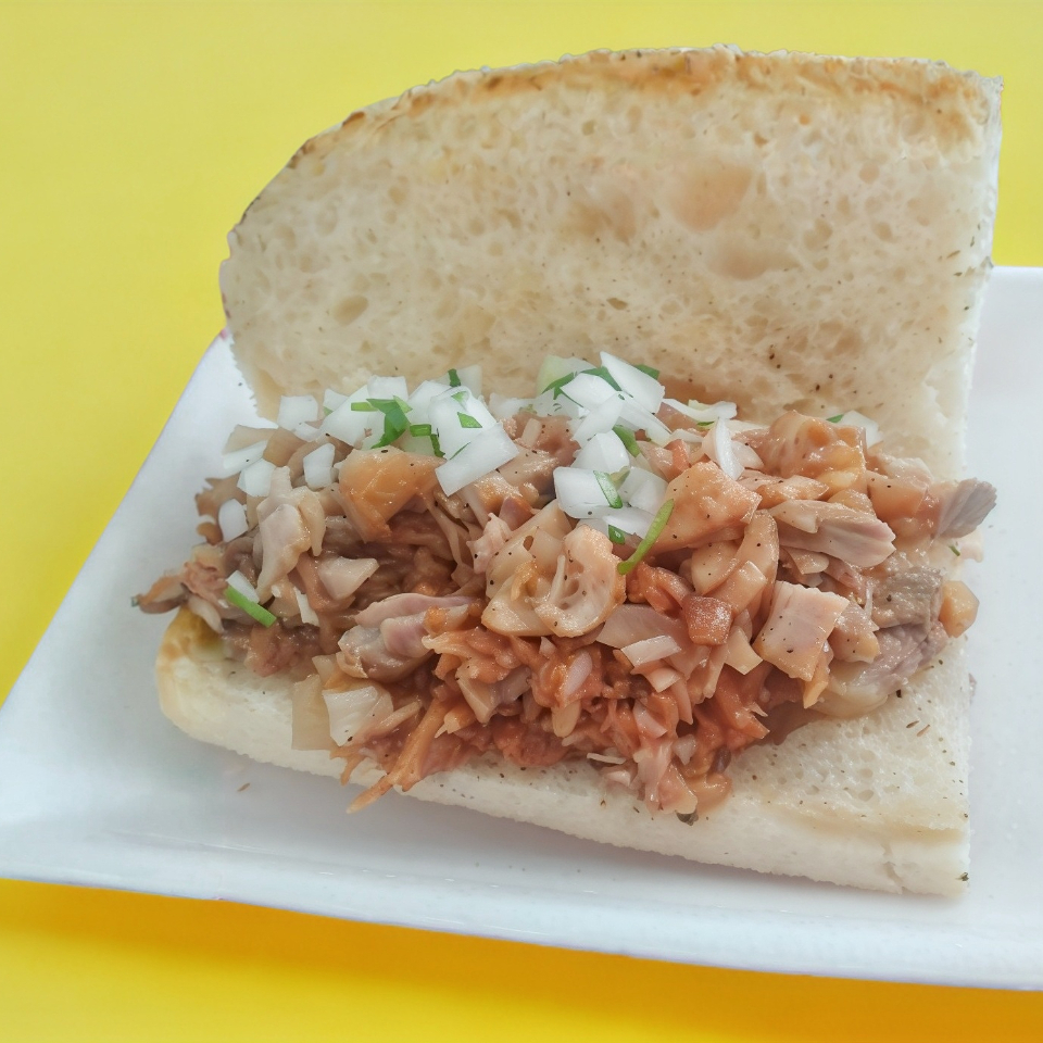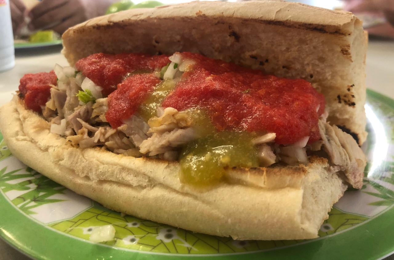 Torta de Carnitas: Incluye 3 tipos de salsas (chile, tomate rojo y tomate verde) y cebolla.