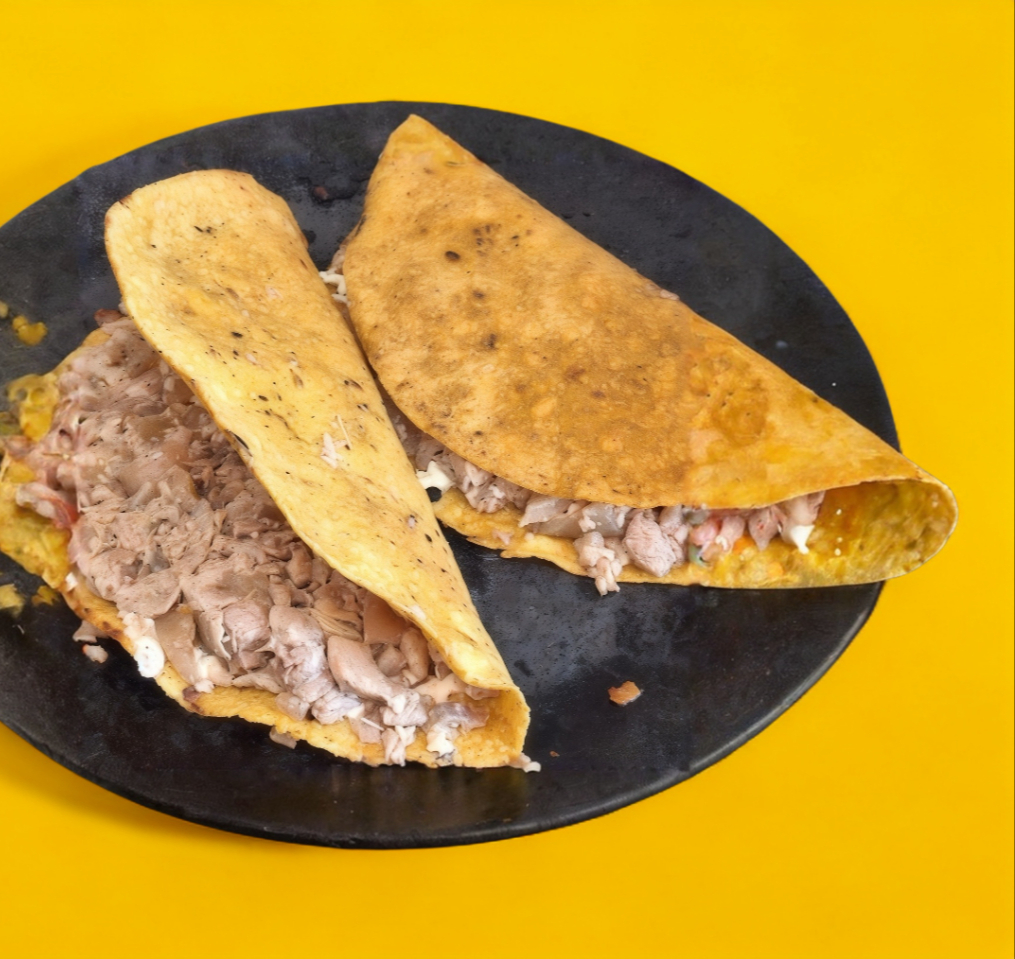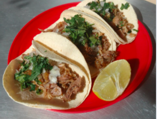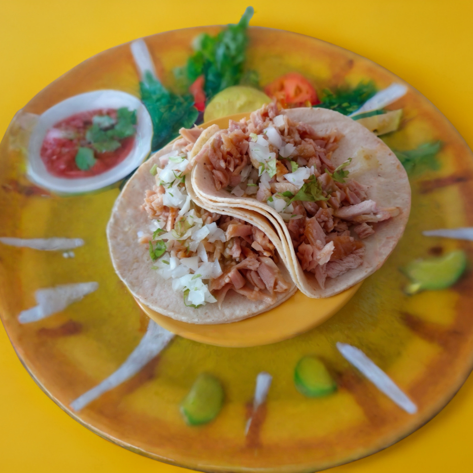Taco de Carnitas: Incluye 3 tipos de salsas (chile, tomate rojo y tomate verde) y cebolla.
