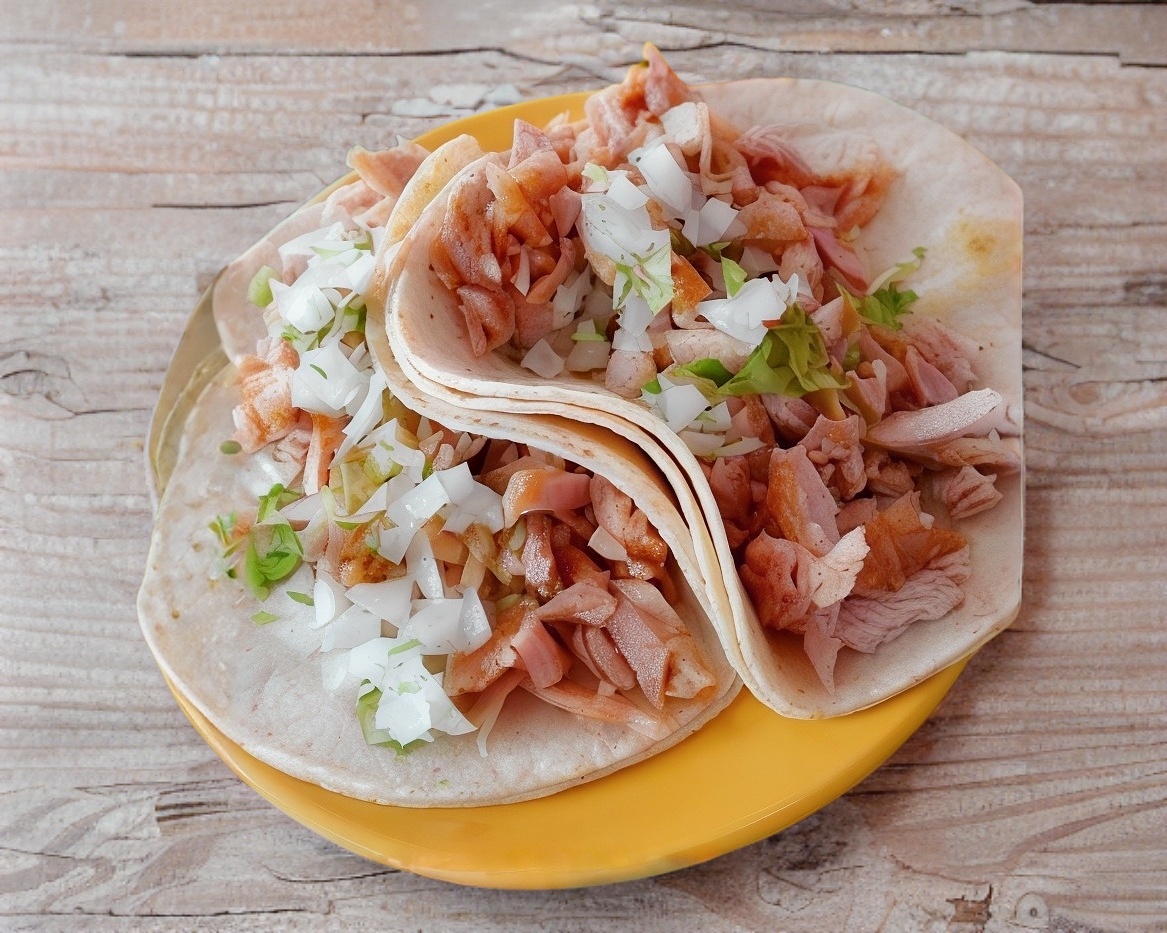 Taco de Carnitas: Incluye 3 tipos de salsas (chile, tomate rojo y tomate verde) y cebolla.
