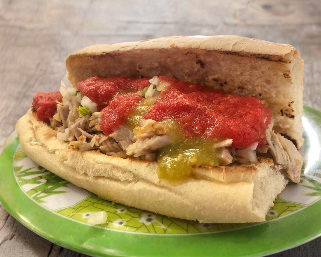 Torta de Carnitas: Incluye 3 tipos de salsas (chile, tomate rojo y tomate verde) y cebolla.