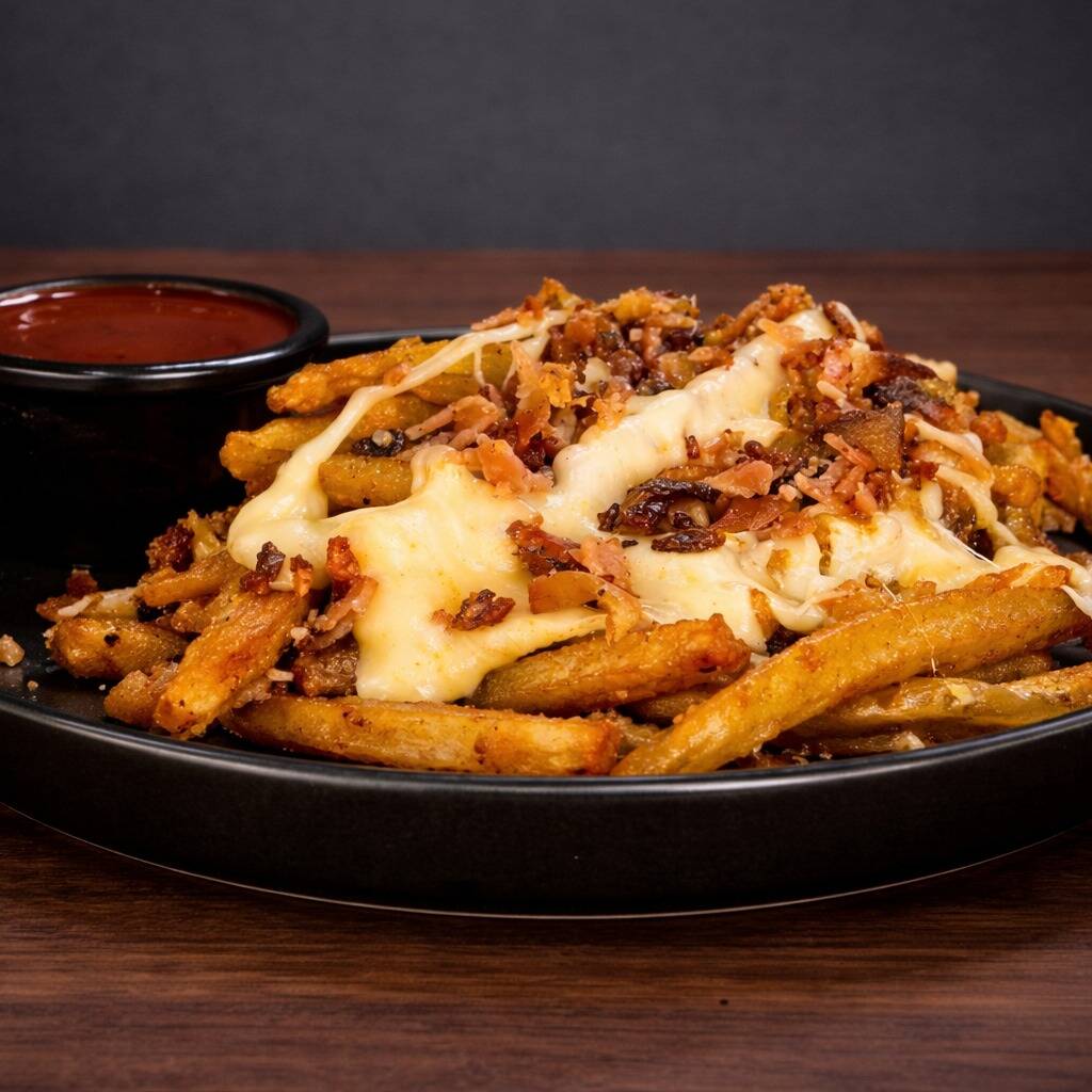 torta de carne asada, cebolla asada, frijol, queso mozzarella, queso chédar y tocino crujiente acompañada de papas fritas y aderezos de ajo y chipotle