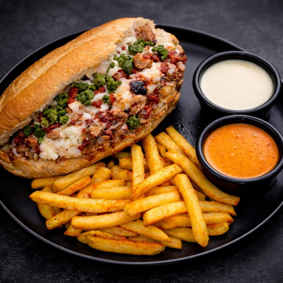 torta de asado con chorizo verde, frijol y queso mozzarella acompañada de papas fritas y aderezos de ajo y chipotle