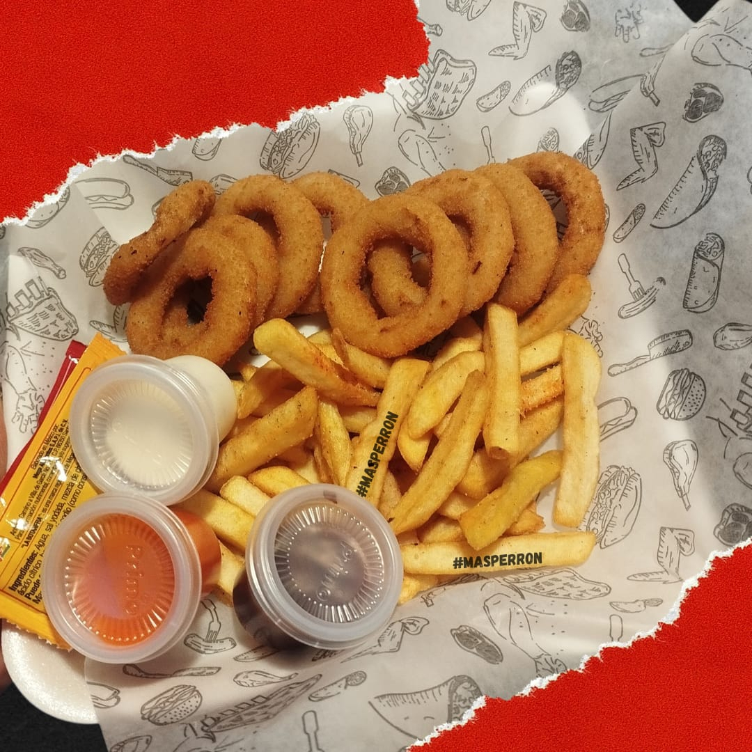 2 hamburguesas carne a elegir mas tu ingrediente favorito a elegir + aros cebolla tu eliges las pz + 2 papas francesas