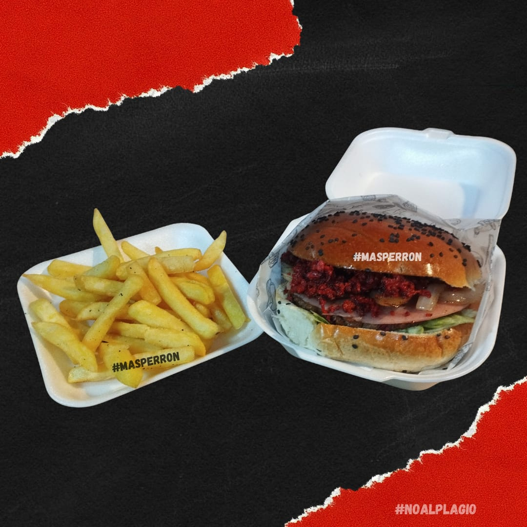 Pan brioche con ajonjoli negro, carne de tu eleccion, chorizo frito, queso americano, jamon pavo, cebolla frita, lechuga, mayonesa, catsup. incluye chile aparte. puedes añadir si lo deseas papas a la francesa y tocineta. (actualizacion 18/10/2025)