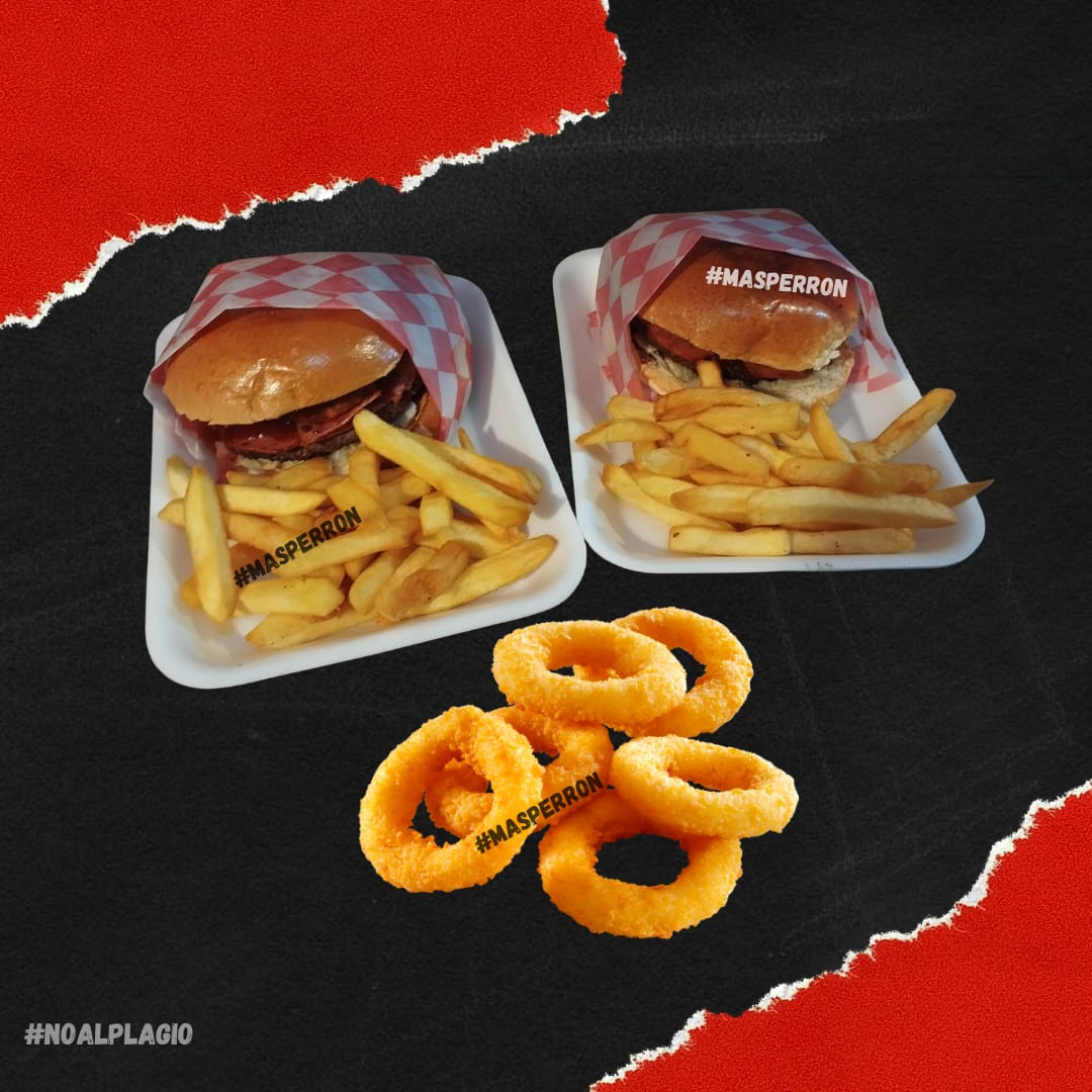 2 hamburguesas carne a elegir 6 aros cebolla 1 orden de papa