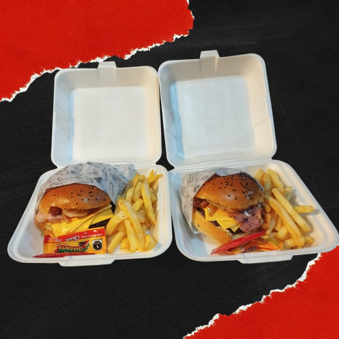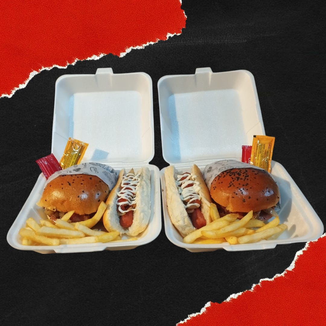 2 Hamburguesas con chorizo y carne a elegir + 2 hot dog a elegir + Papas a elegir.