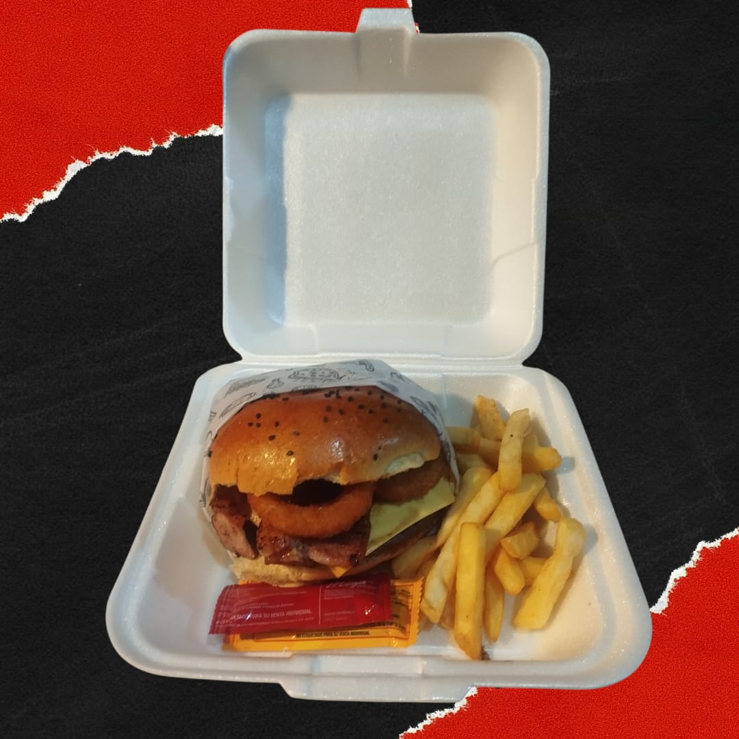 Pan brioche, carne a elegir, tocino, queso, vegetales, aderezos incluye orden de papas francesa. Bebida 500 ml