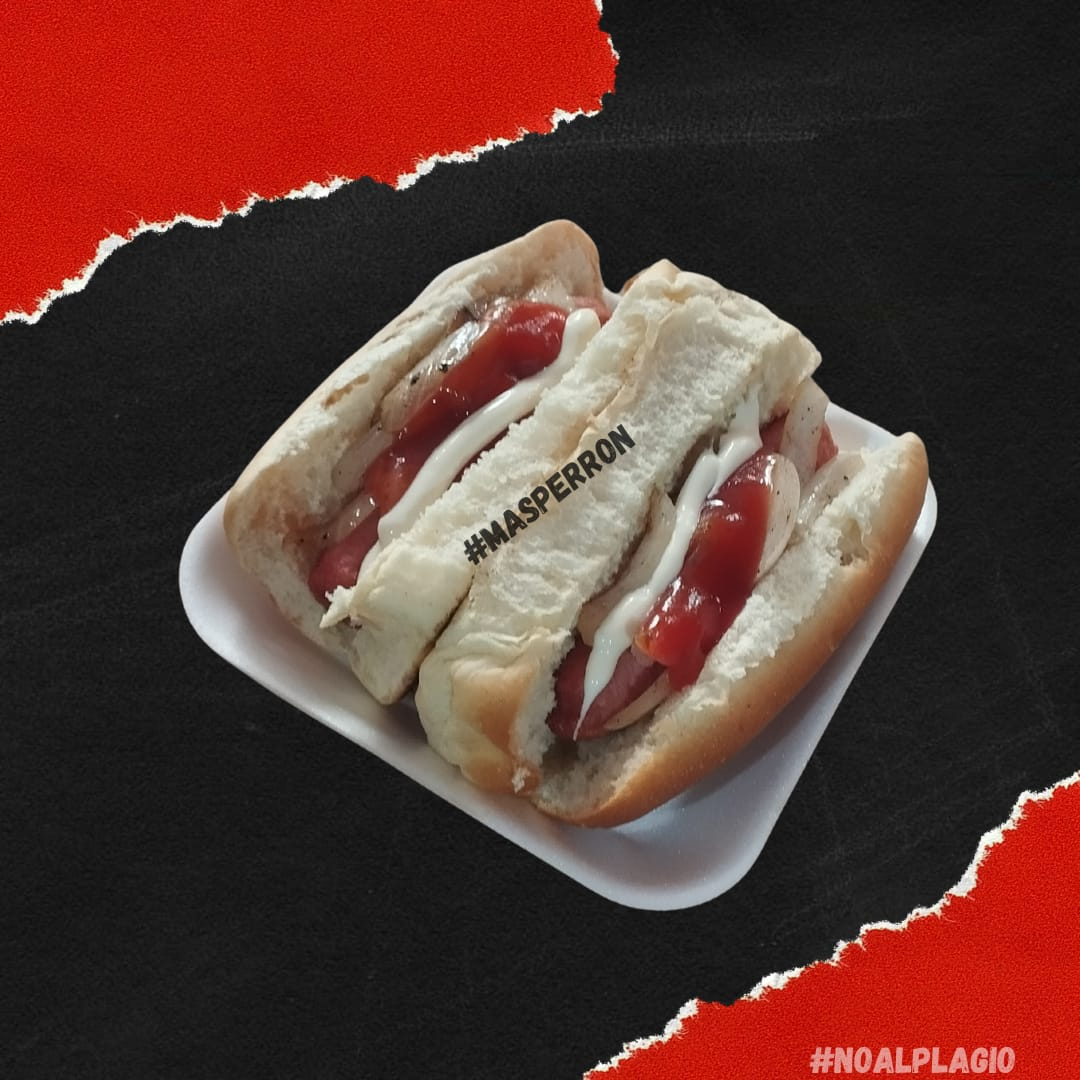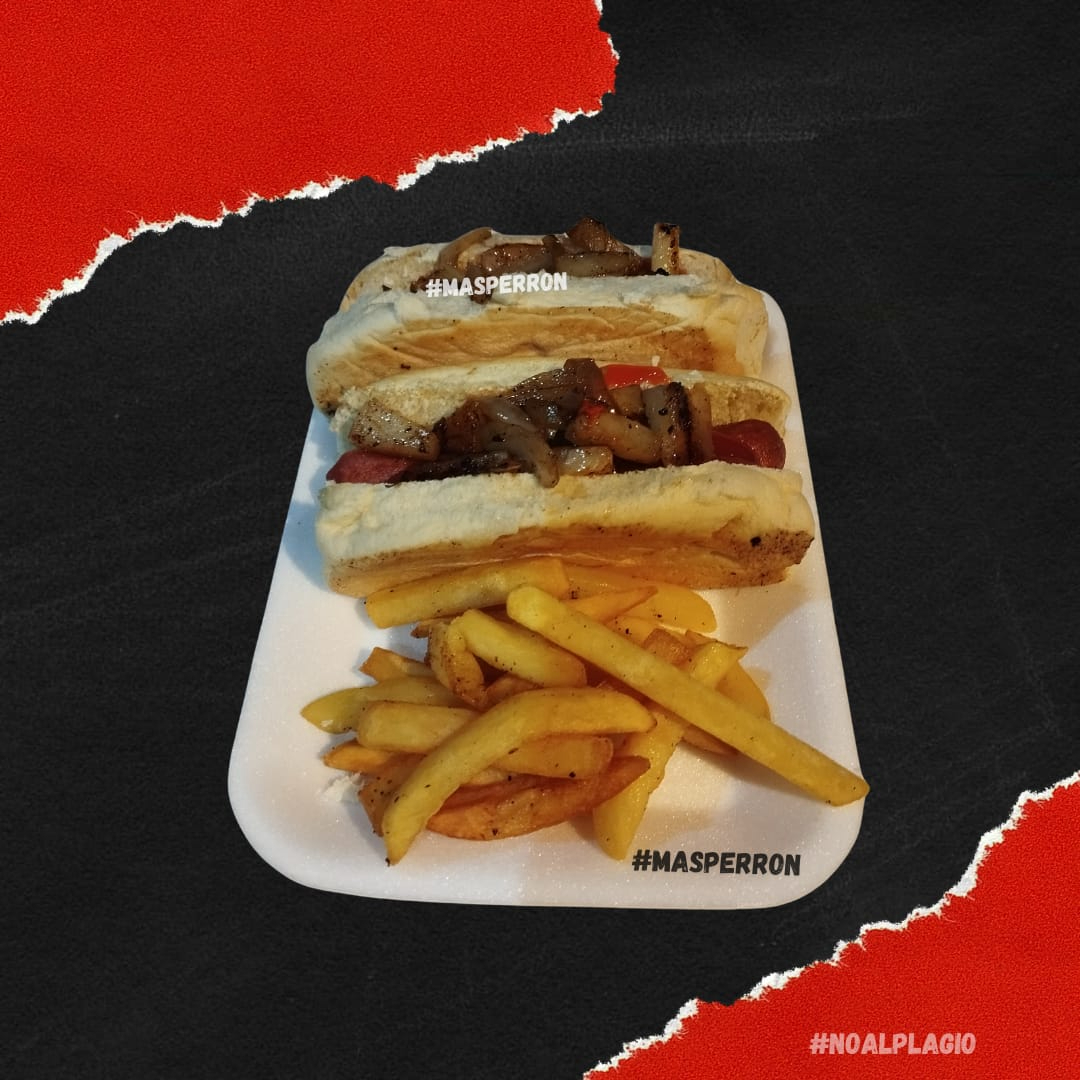 Pan, salchicha, cebolla frita, mayonesa, catsup, incluye papas. catsup chile aparte