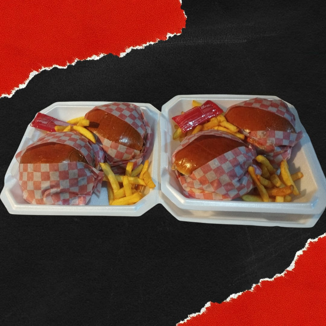 2 Hamburguesas clasicas con carne a elegir + 2 hot dog a elegir + Papas a elegir.