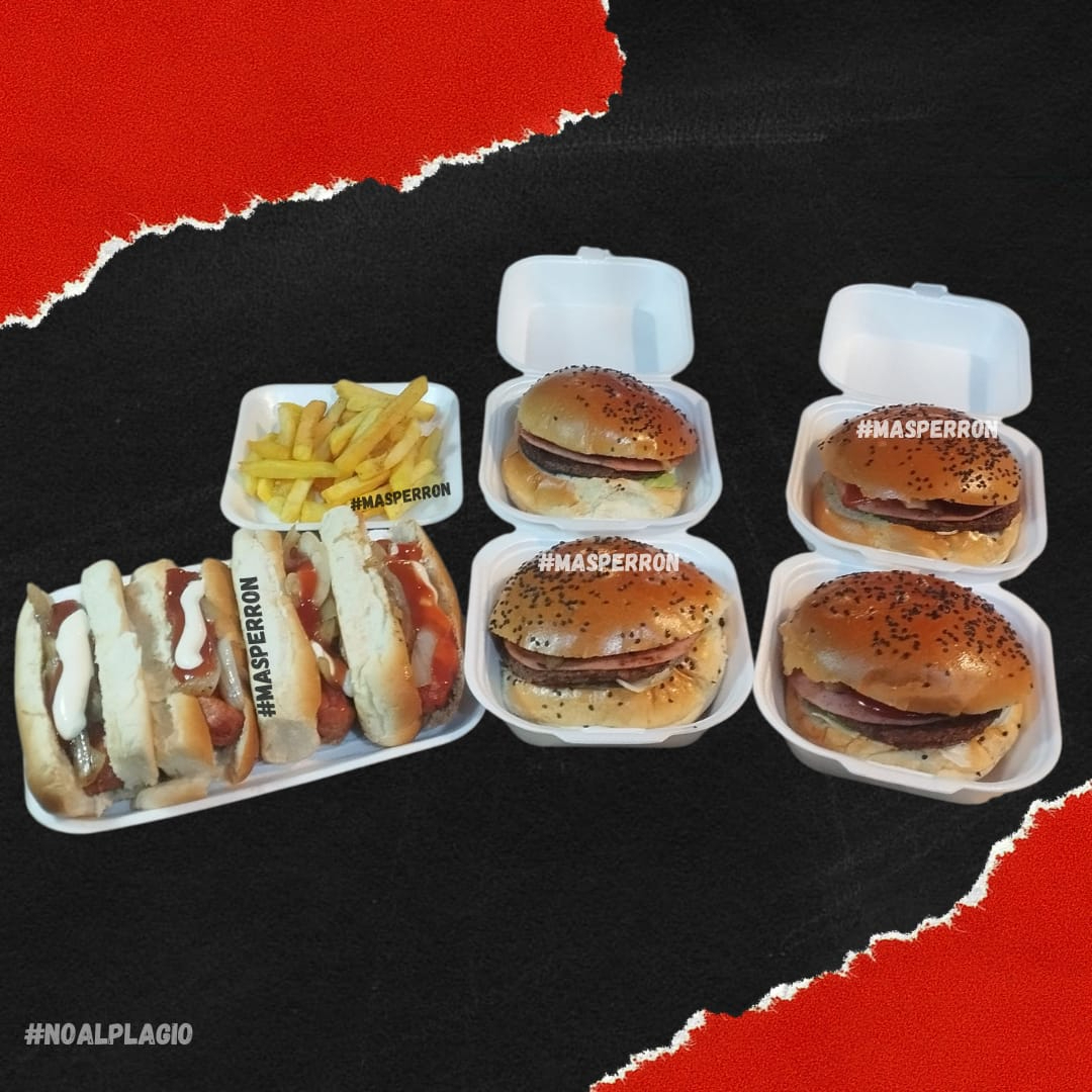 El Combo incluye: 3 hamburguesas res, 2 perros calientes y 1 salchipapa ch (se envia aparte sobre chile y catsup). ingredientes de las hamburguesas: pan brioche con ajonjoli negro, queso americano, jamon, cebolla frita, lechuga, mayonesa y catsup. ingredientes de los perros calientes: Pan natural, salchicha, cebolla frita, mayonesa y catsup.actualizacion 18/10/2025