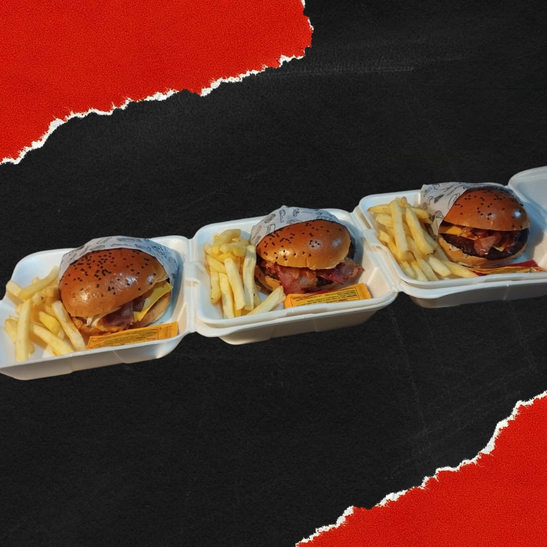 3 Hamburguesas a elegir con cada una con ingrediente extra a elegir 3 hotdogs a elegir 3 papas a elegir