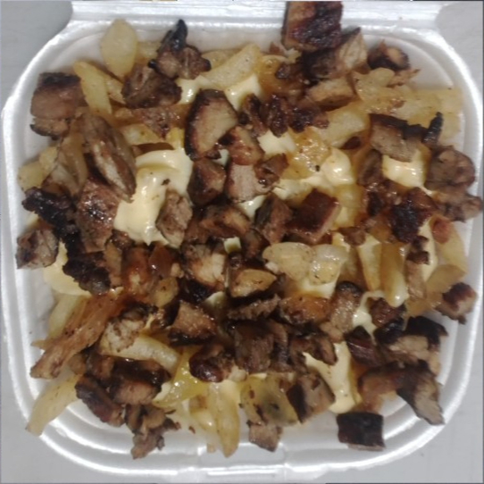 180g aproximadamente de Papas a la Francesa 🍟 con 100g aproximadamente de Queso Fundido 🫕 y 95g aproximadamente de Carné Asada 🥩