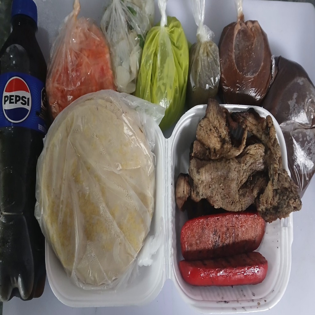 ⅛kg de Carne Asada 🥩 Con Todos Sus Complementos 🍚🧅🥑🍅🌶️🫘➕ 1 Salchicha Asadera 🍠 ➕ ¼ de Tortilla 🫓 ➕ Refresco de 400ml 🥤