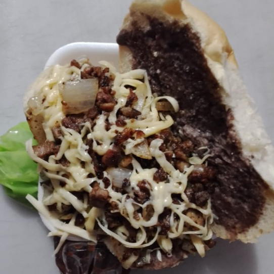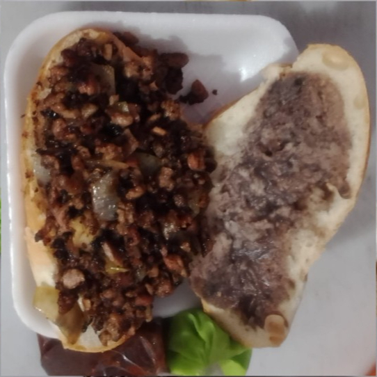 🥔 Bolillo con una capa de 🫘 frijol colado por un lado, 🥩 Carné Asada con 🧅 Cebolla asada ➕ Complementos; Salsa de Aguacate 🥑, Salsa de Tomate Tatemado 🍅 & Salsa de Chile Habanero 🌶️