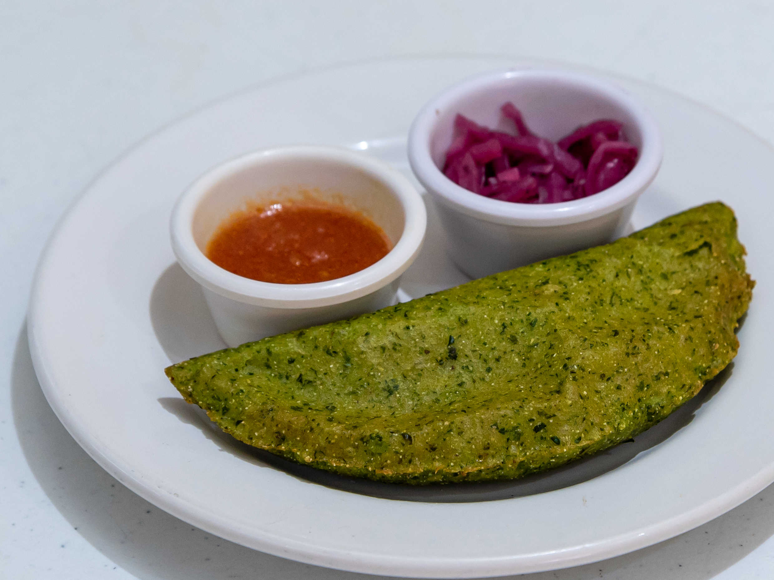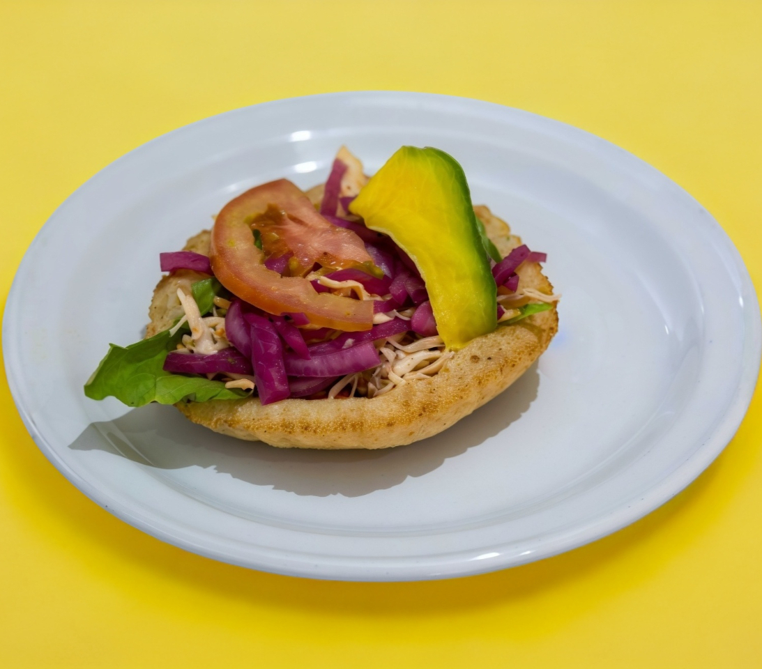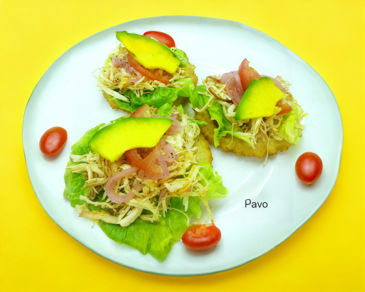 Tortilla hecha con maquina, sin relleno alguno, acompañada de pavo desmenuzado, lechuga, pavo, cebolla curtida, tomate y aguacate.