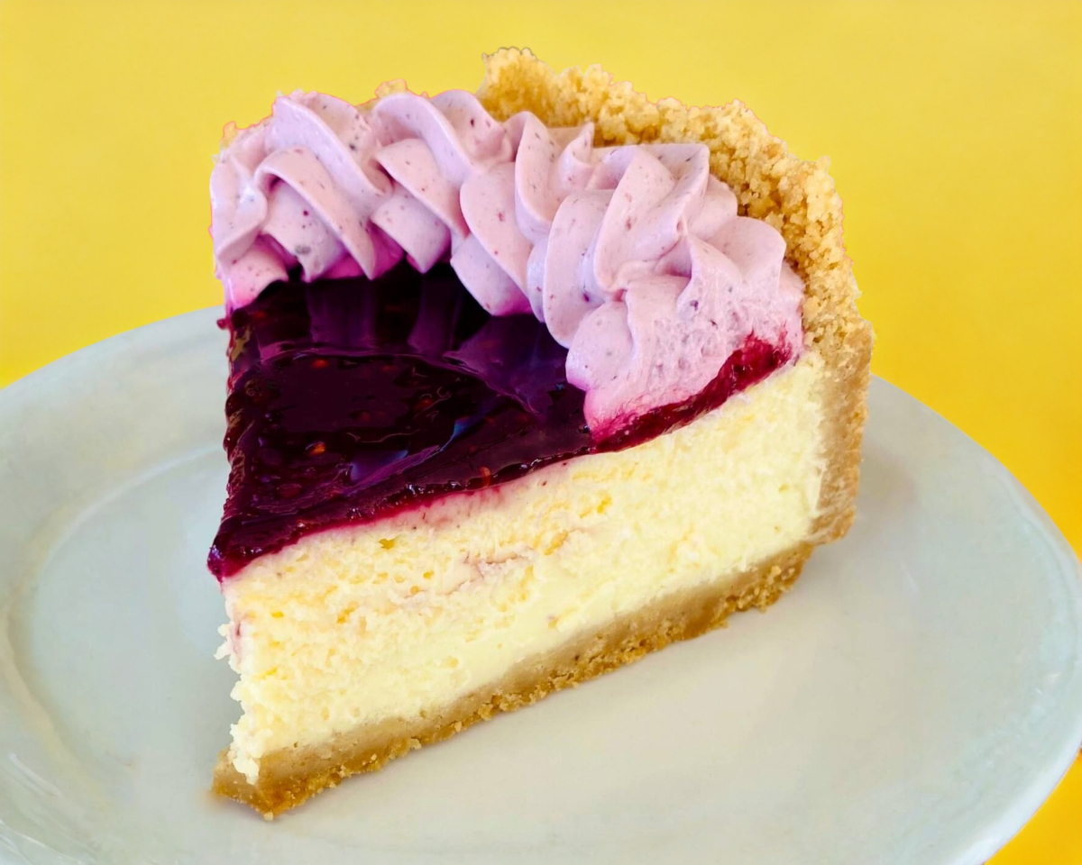 Postre Cremoso e irresistible, hecho a base de crema de queso con base de galleta y mermelada de frutos rojos