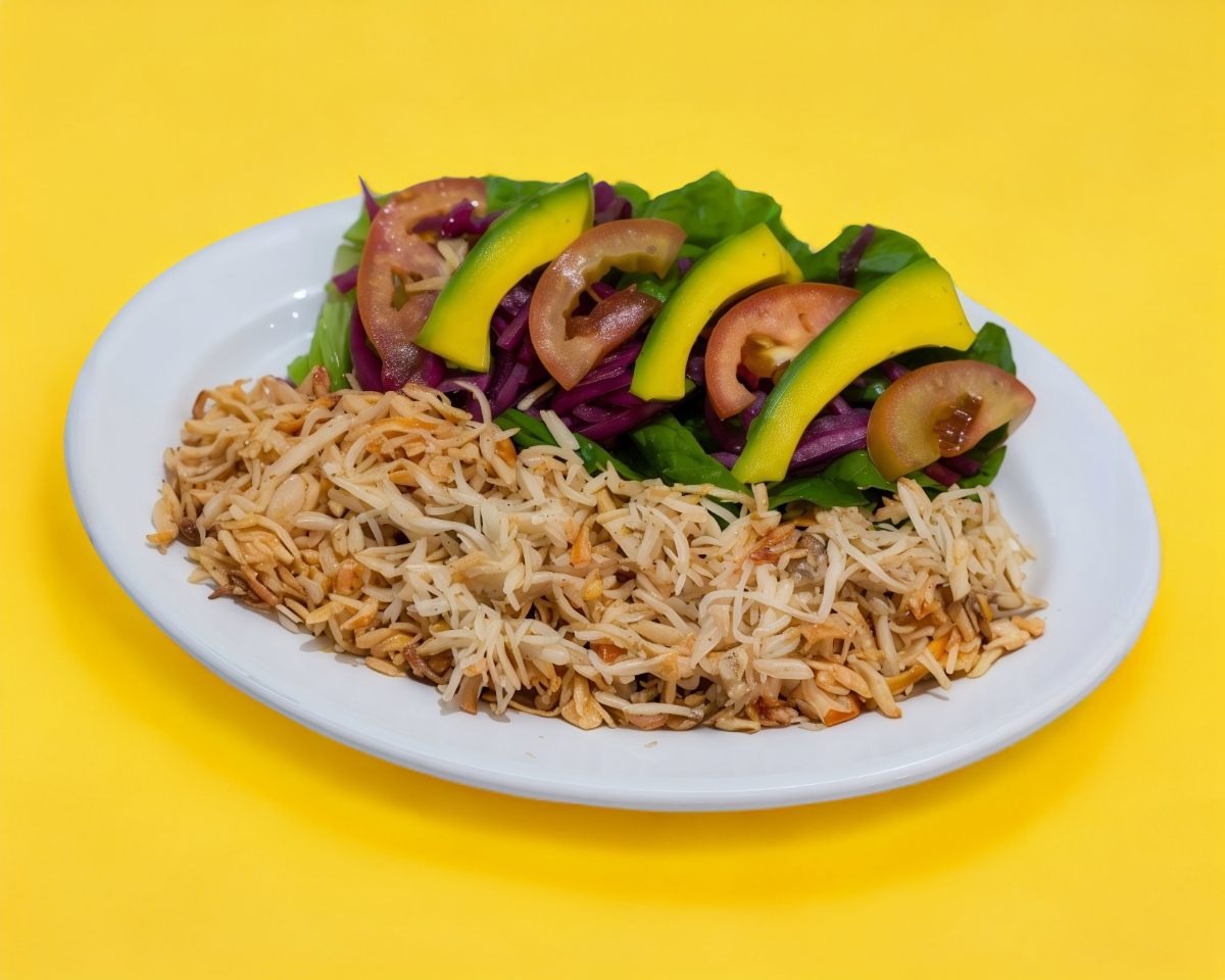 Pavo desmenuzado acompañado de ensalada (lechuga, tomate cebolla y aguacate).