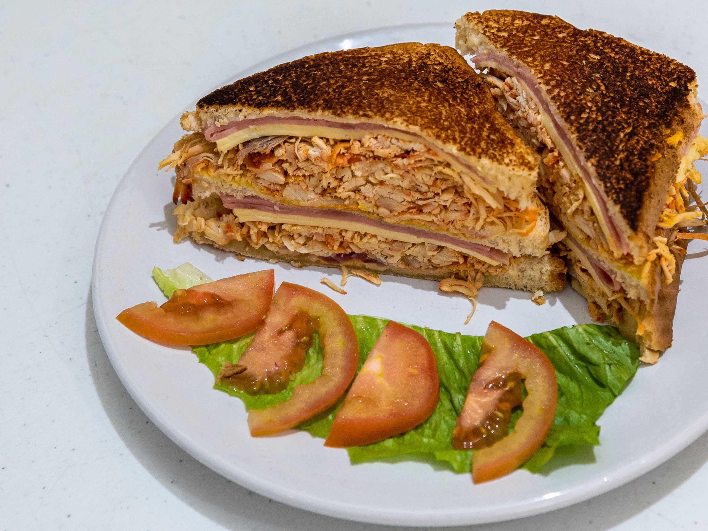 Sandwiche con 3 pzas. de pan, acompañado de pavo desmenuzado, Jamon de pavo, Queso manchego y cebolla roja curtida y aderezado con mayonesa, mostaza y mantequilla