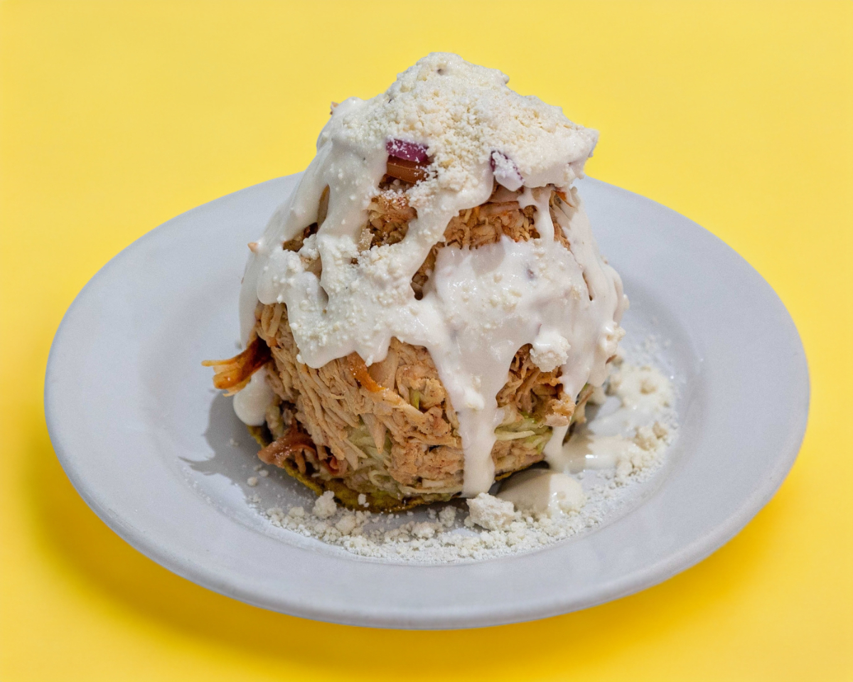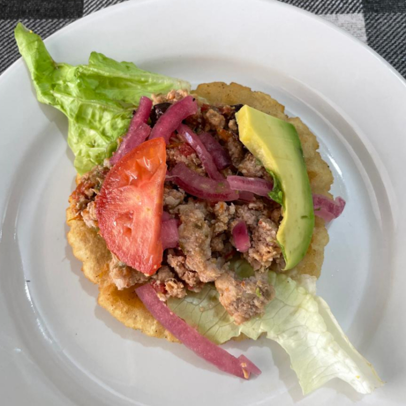Tostada de maíz acompañada de romanita picada, pavo desmenuzado, tomate, cebolla curtida, queso sopero y crema de leche.