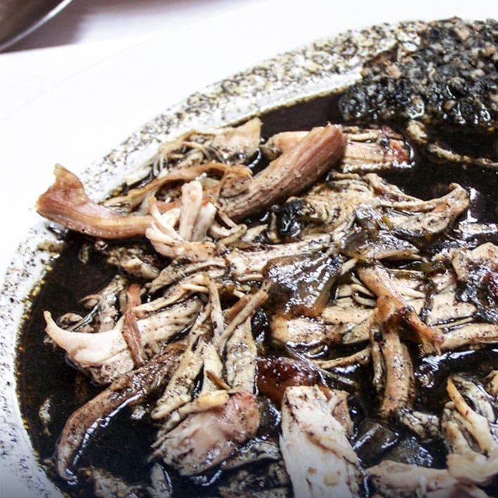 Pavo en gajos y but negro, cubierto con recado negro acompañado de aguacate, chile habanero y tortillas.