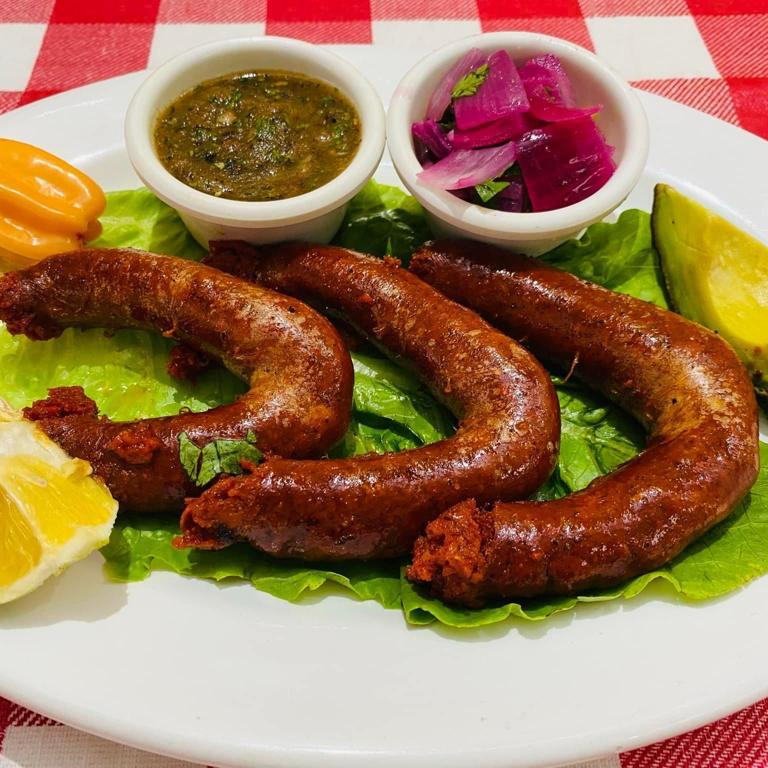 3 Tiras de longaniza, acompañada de ensalada verde, cebolla roja asada, chiltomate, naranja agria, frijol colado, aguacate, chile habanero y tortillas.