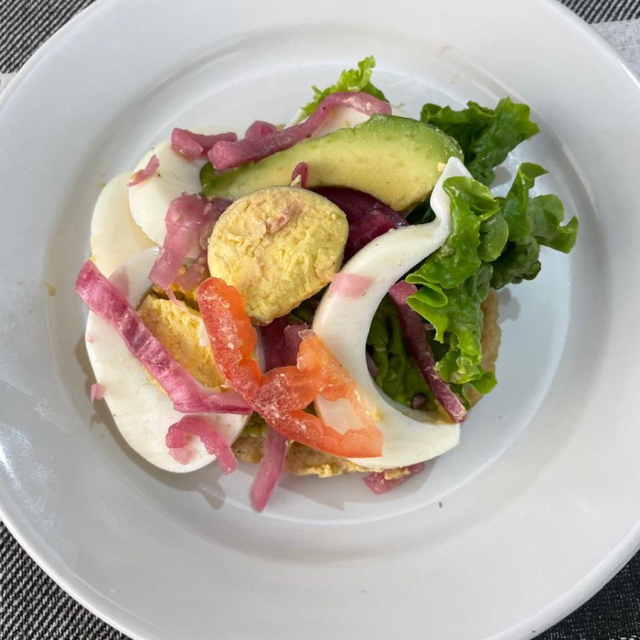 Tortilla hecha con maquina, sin relleno alguno, acompañada de Huevo cocido, lechuga, pavo, cebolla curtida, tomate y aguacate.