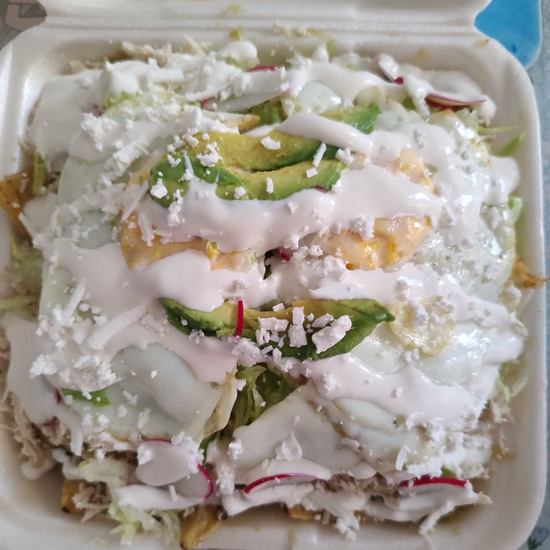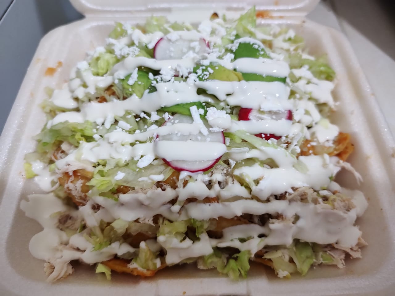 Totopos pollo romanita cebolla aguacate media crema queso manchego rabano