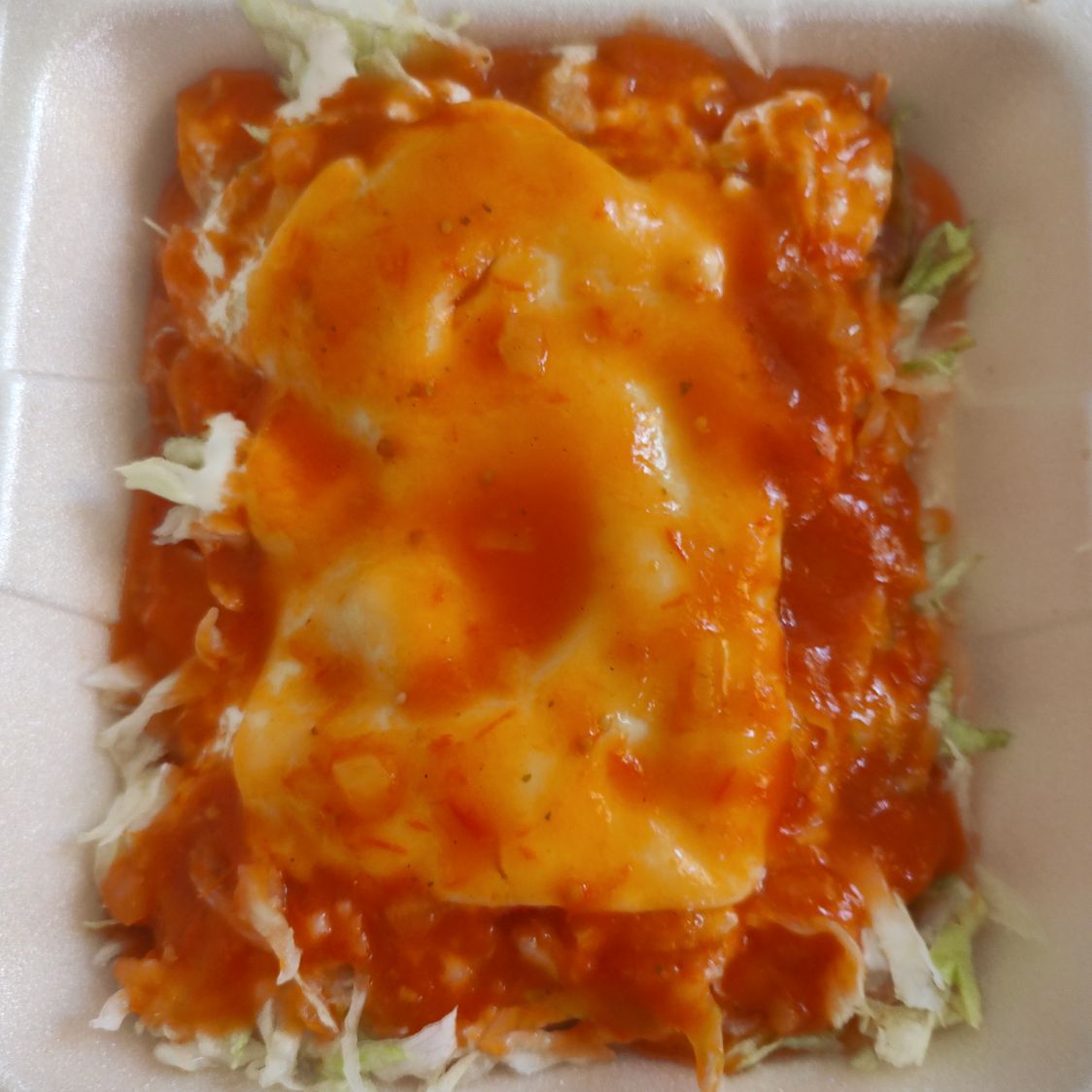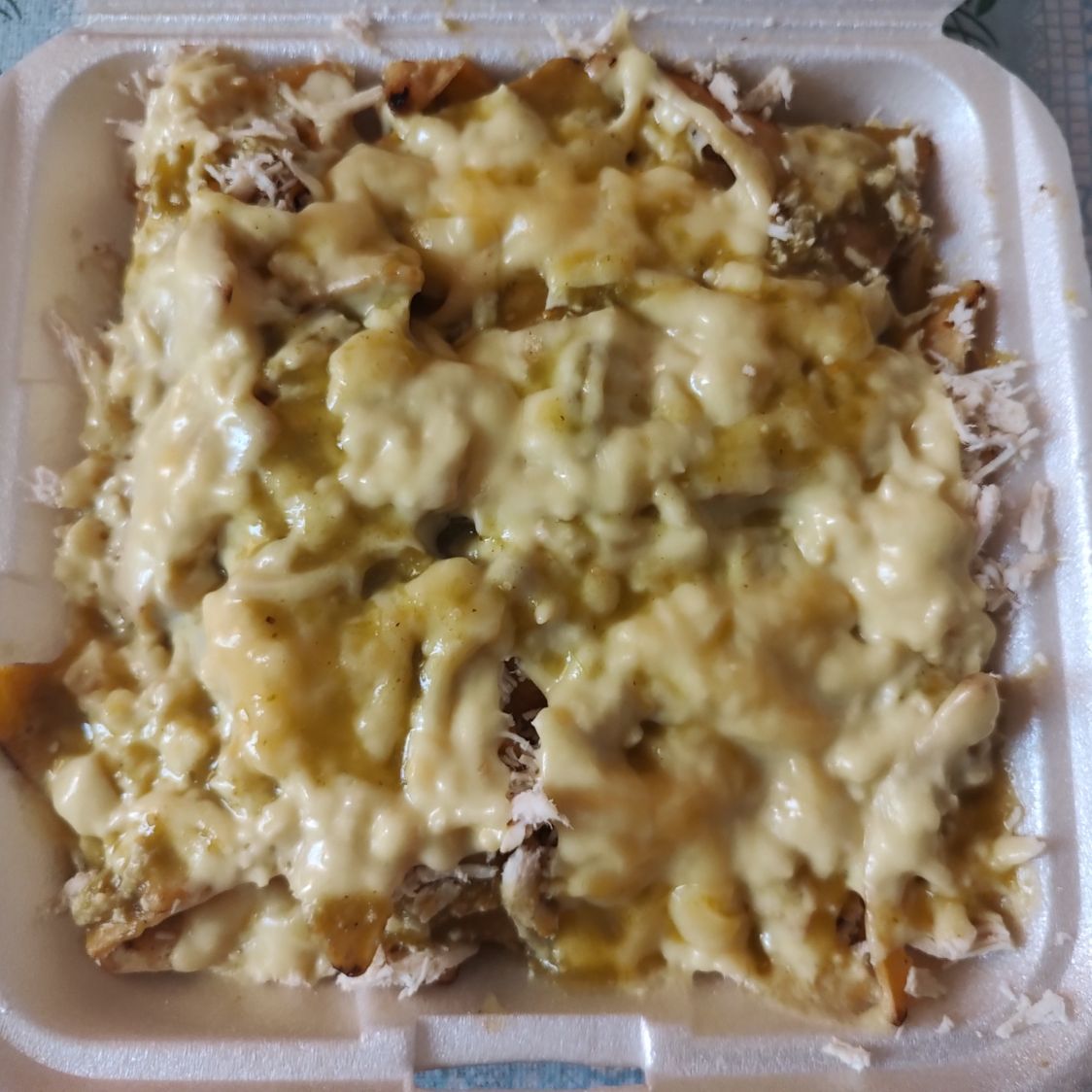 Totopos, pollo, salsa, verde, romanita, media crema, cebolla, aguacate, 2 huevos estrellados, queso manchego gratinado