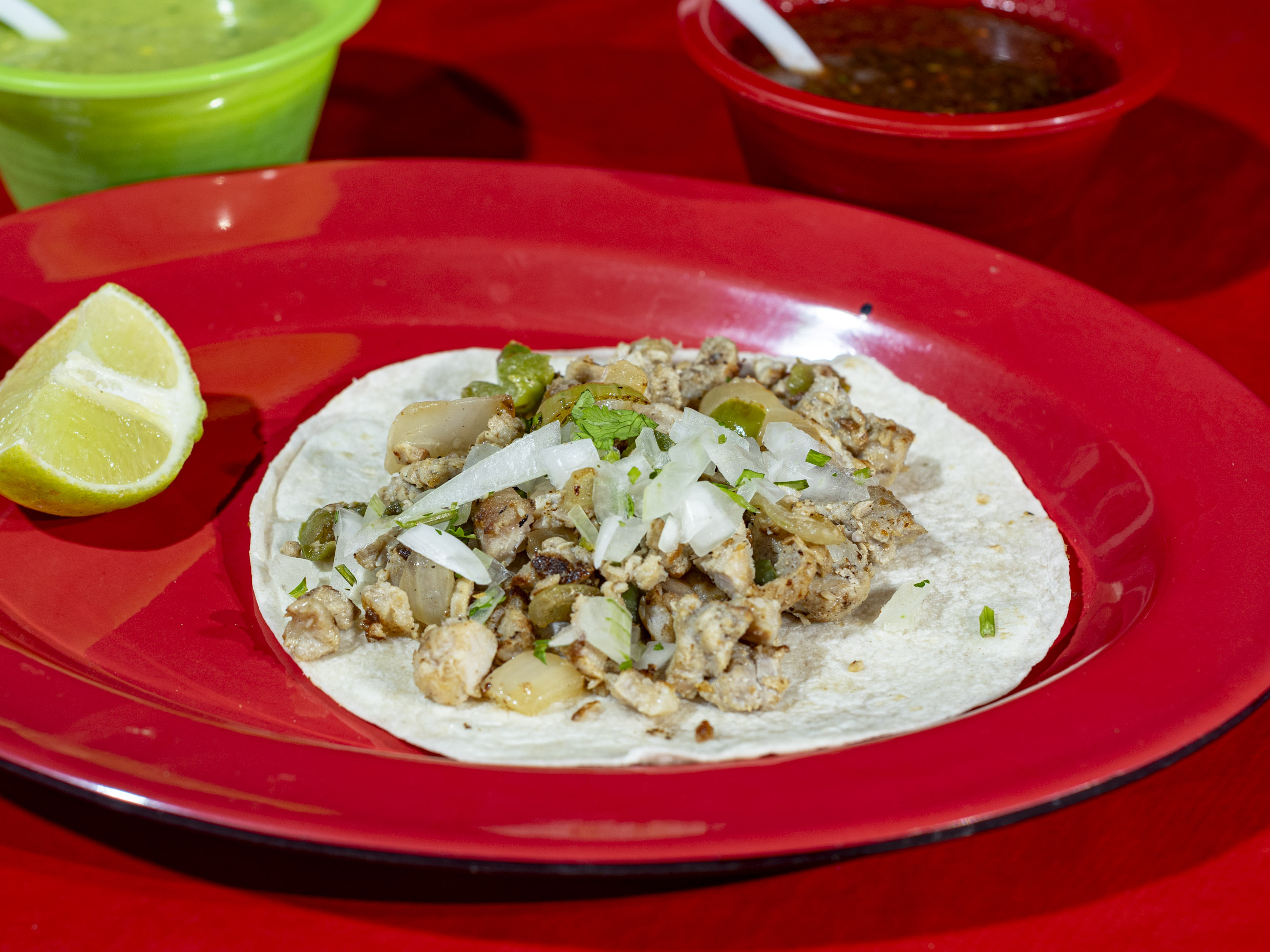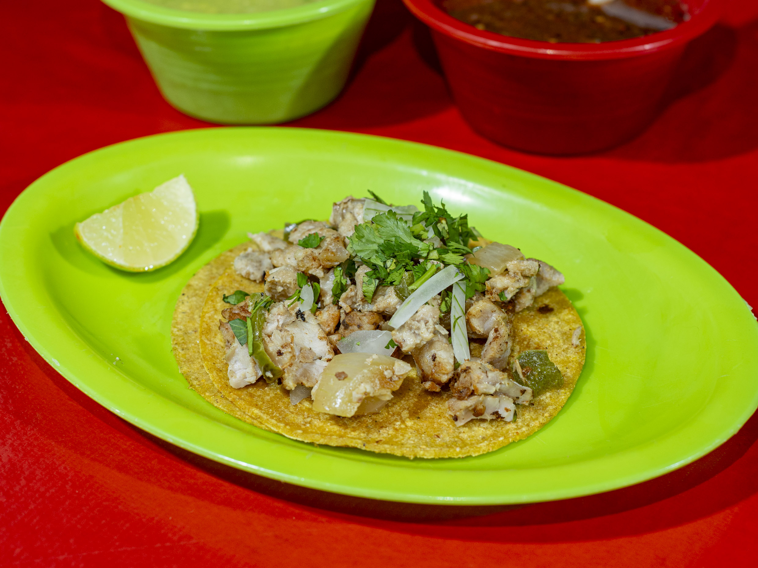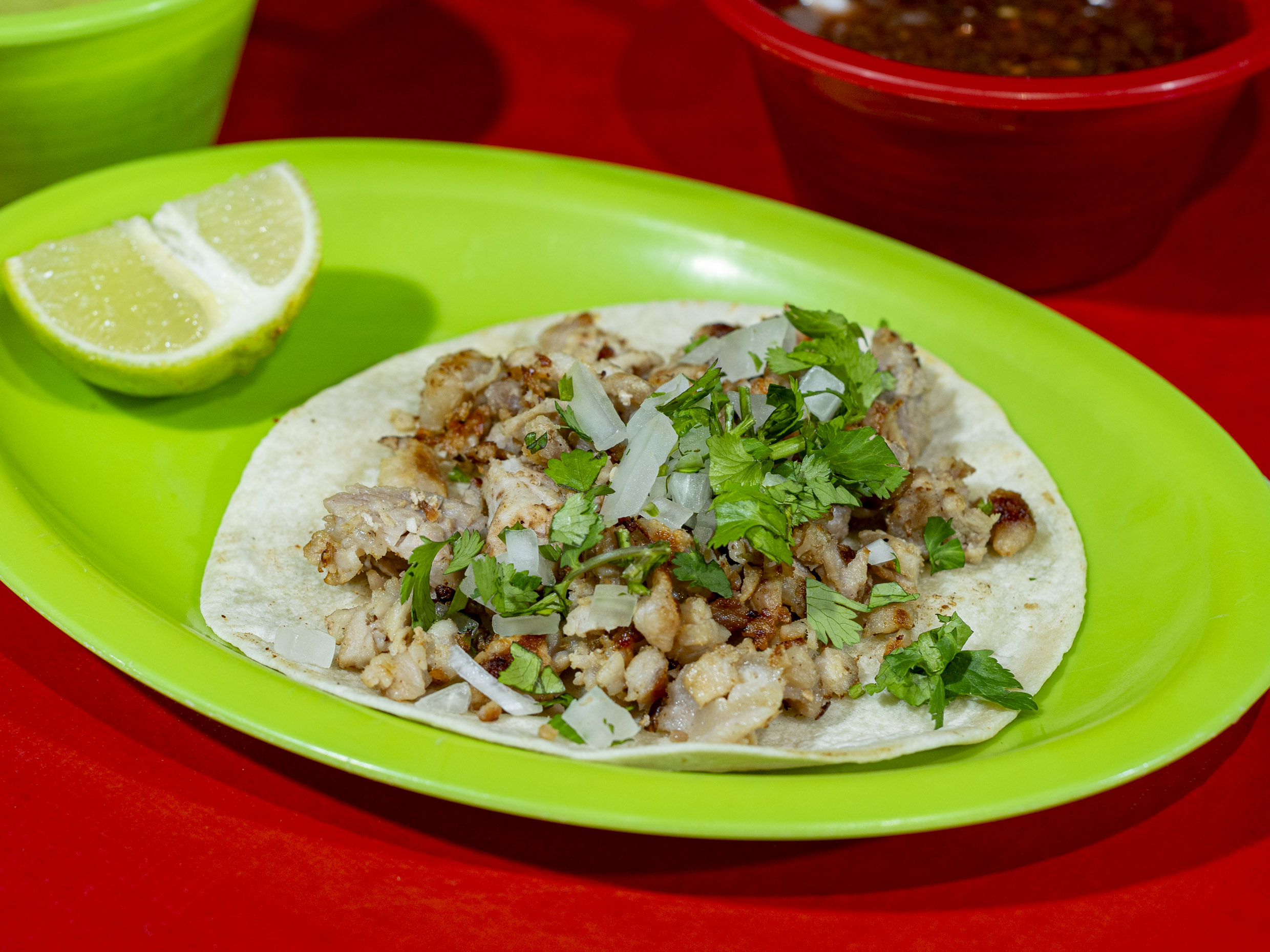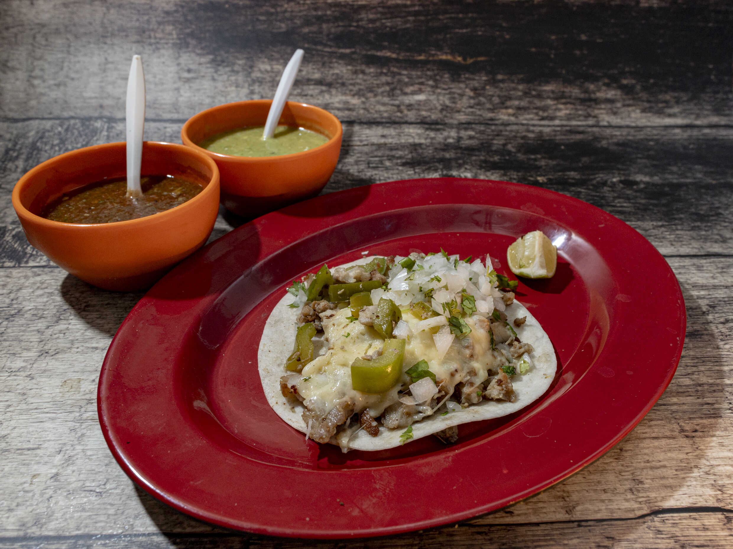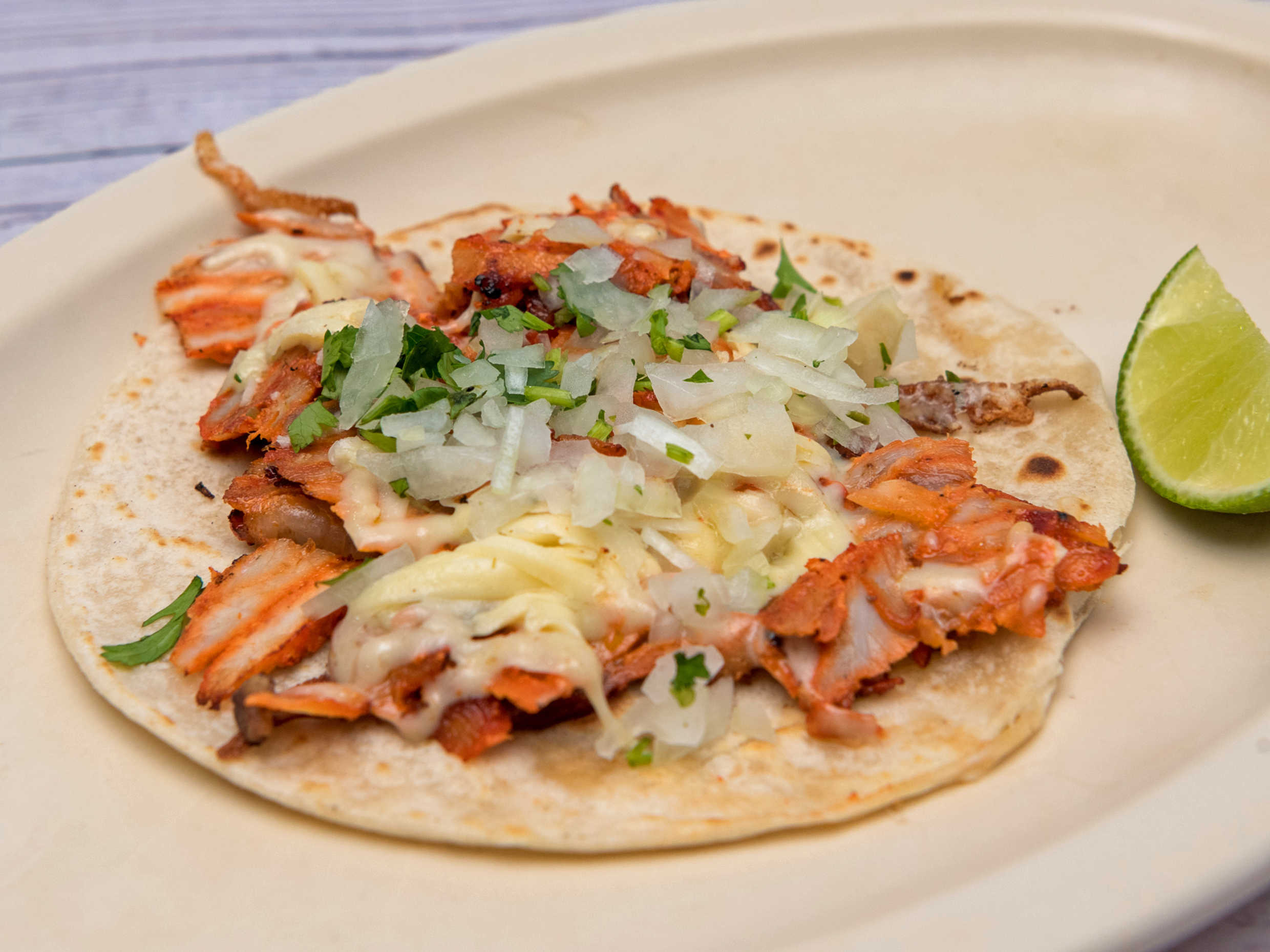 Carne al pastor, cebolla, cilantro, salsa verde, salsa roja,limón,tortilla de maiz