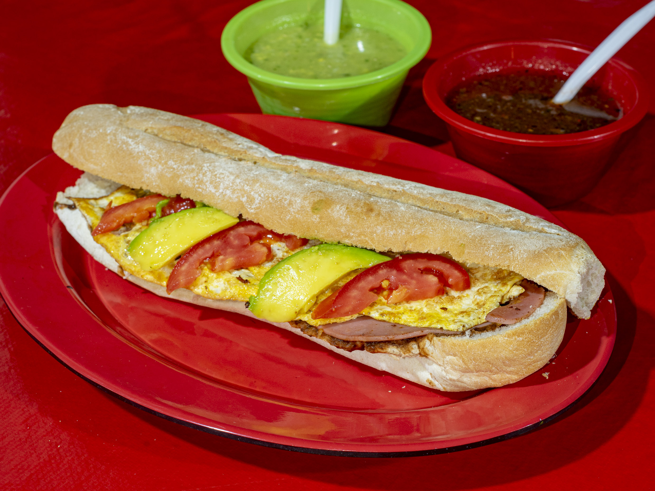 Pierna,jamón,queso,,frijol,jitomate,,aguacate cebolla/cilantro