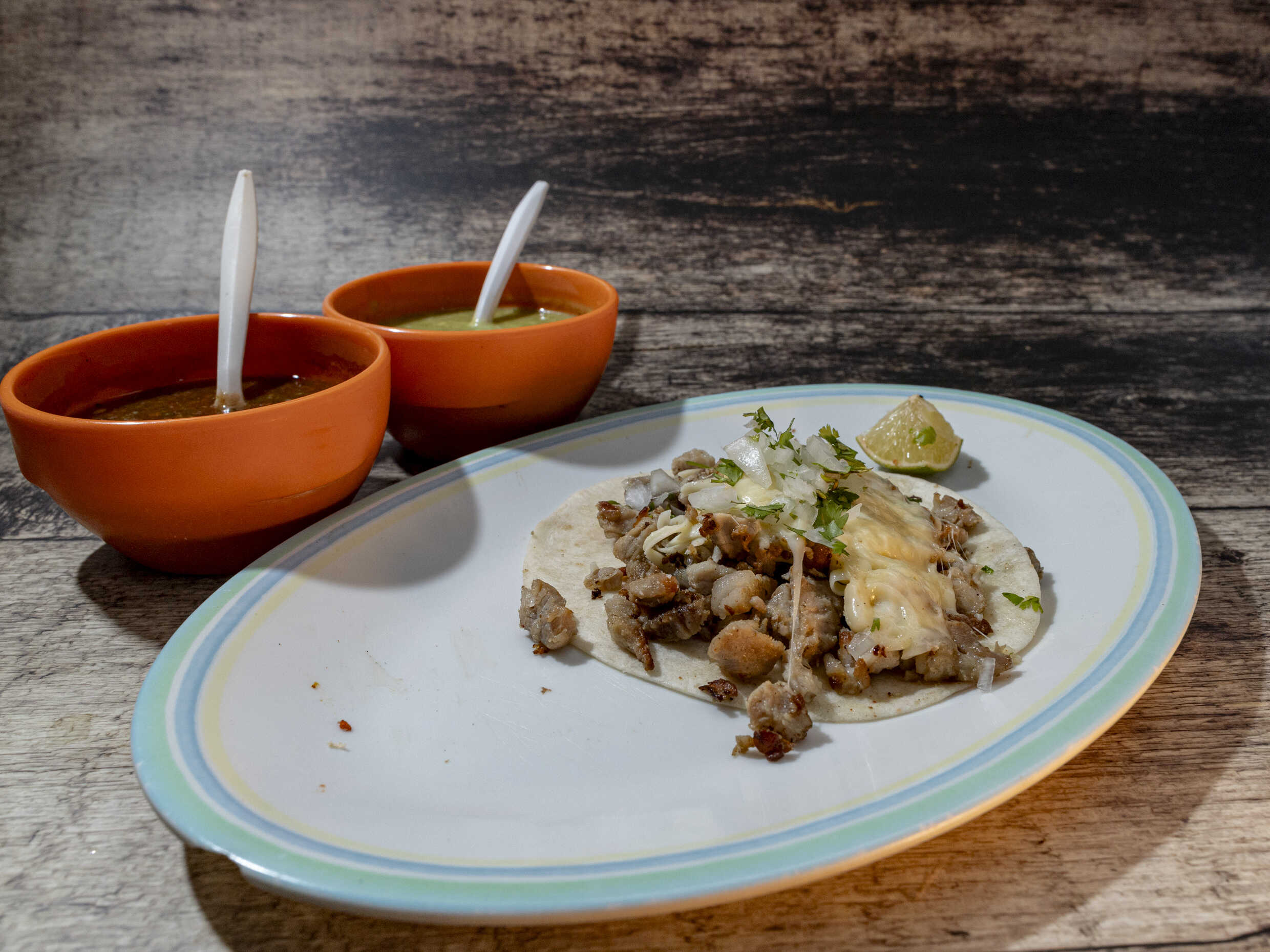 Carne al pastor, cebolla, cilantro,salsa verde,salsa roja ,tortillas de maiz