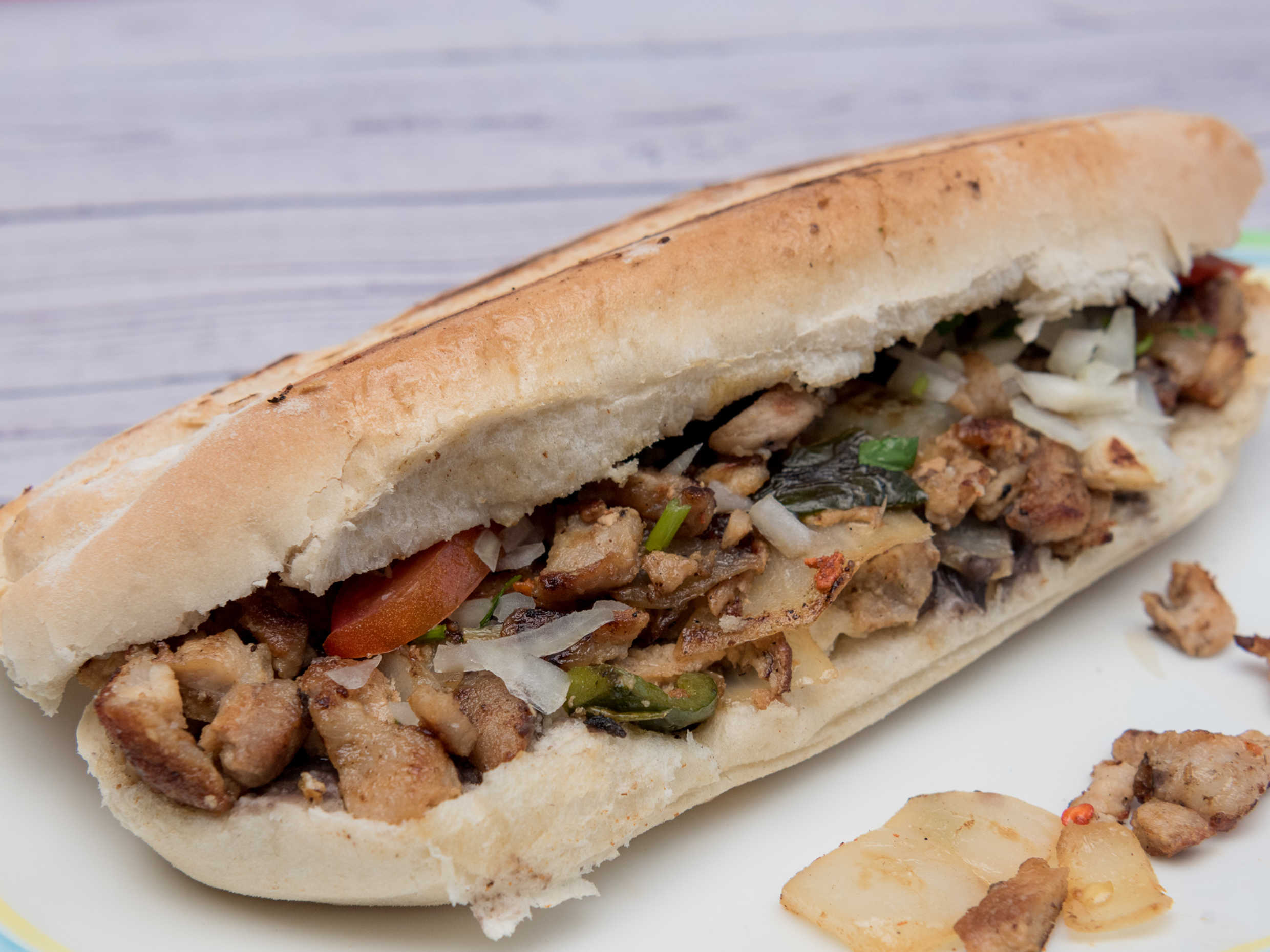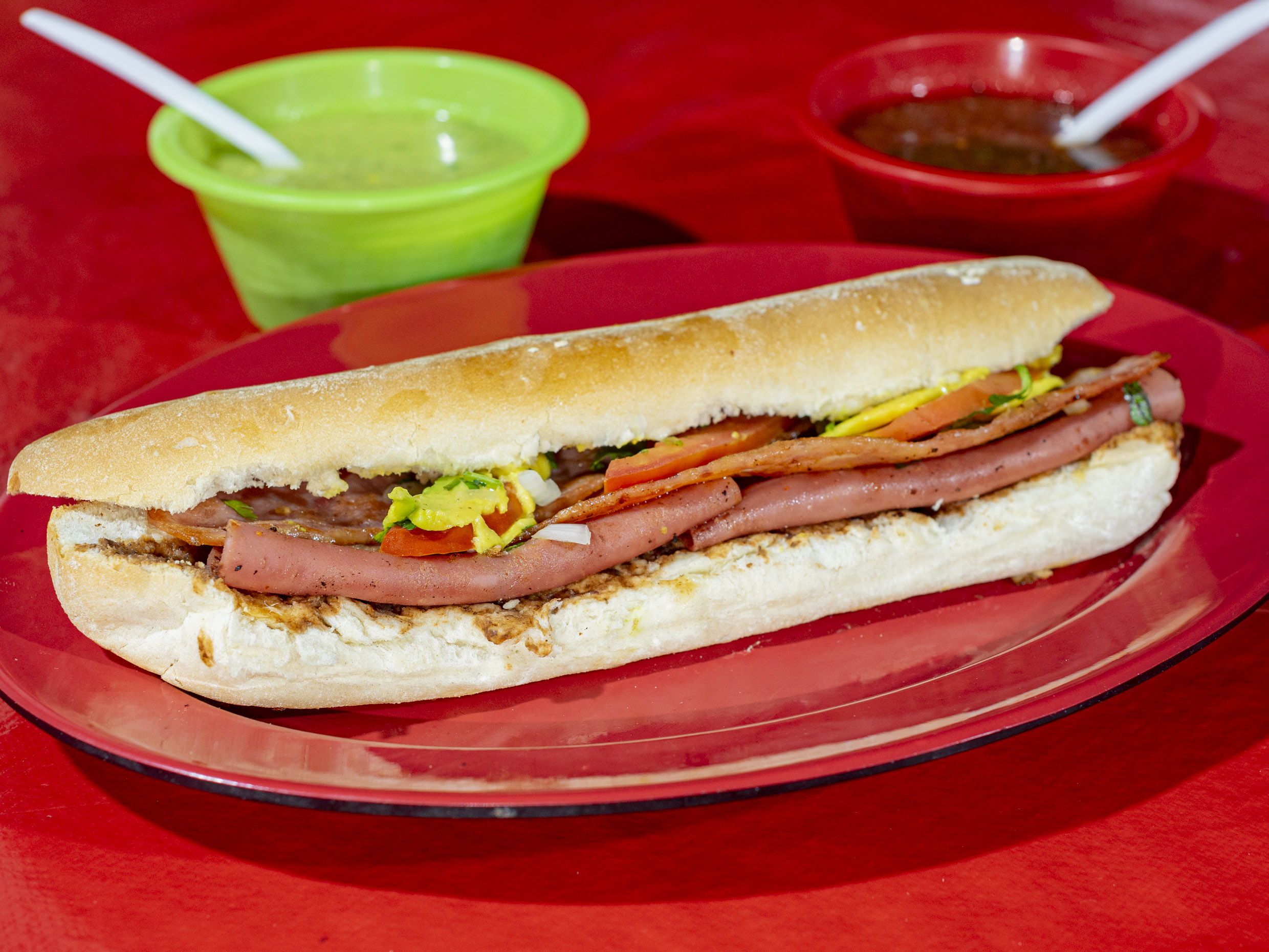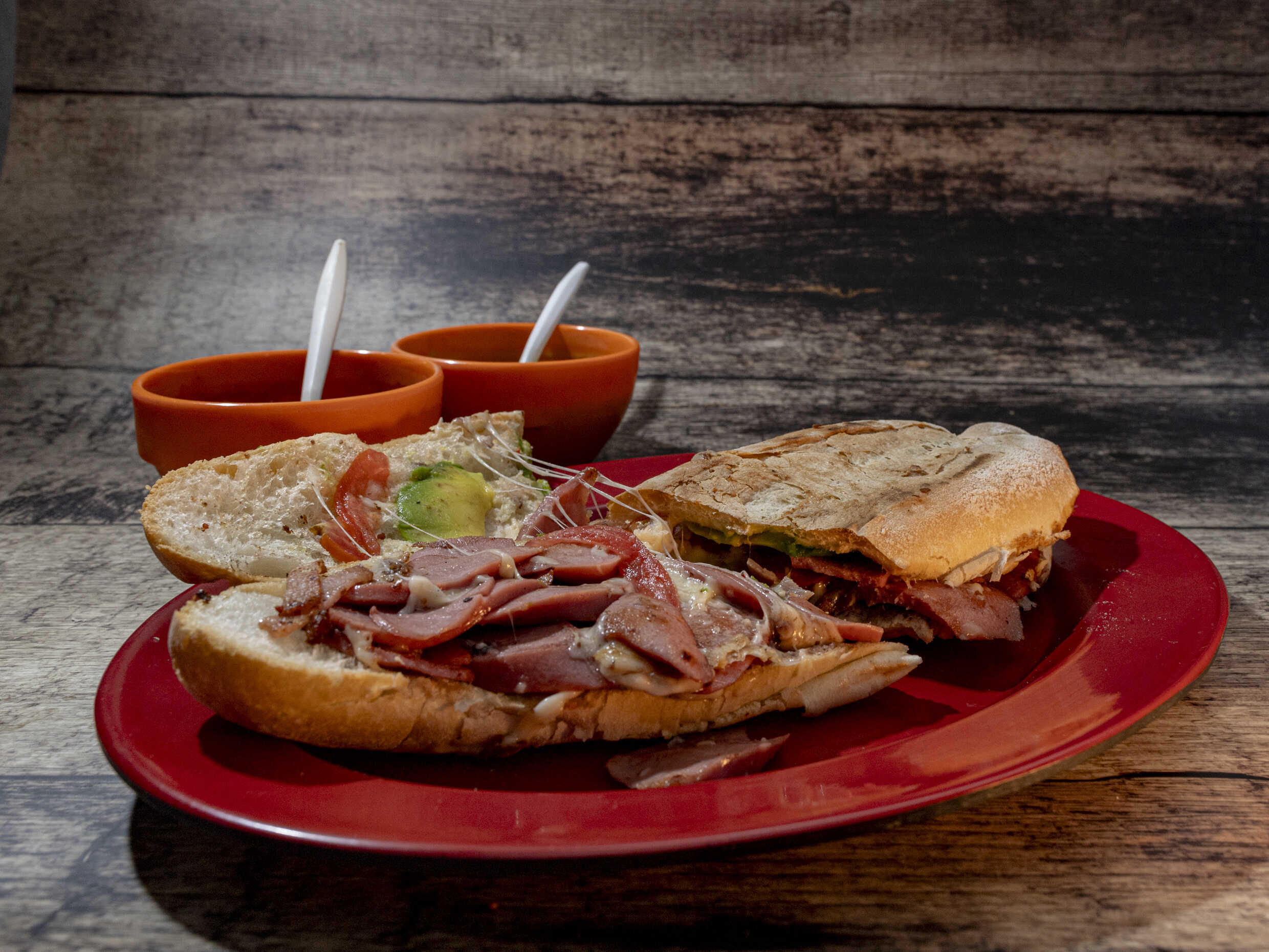 Carne asada, jamón, queso, frijol, jitomate, aguacate, cebolla, cilantro