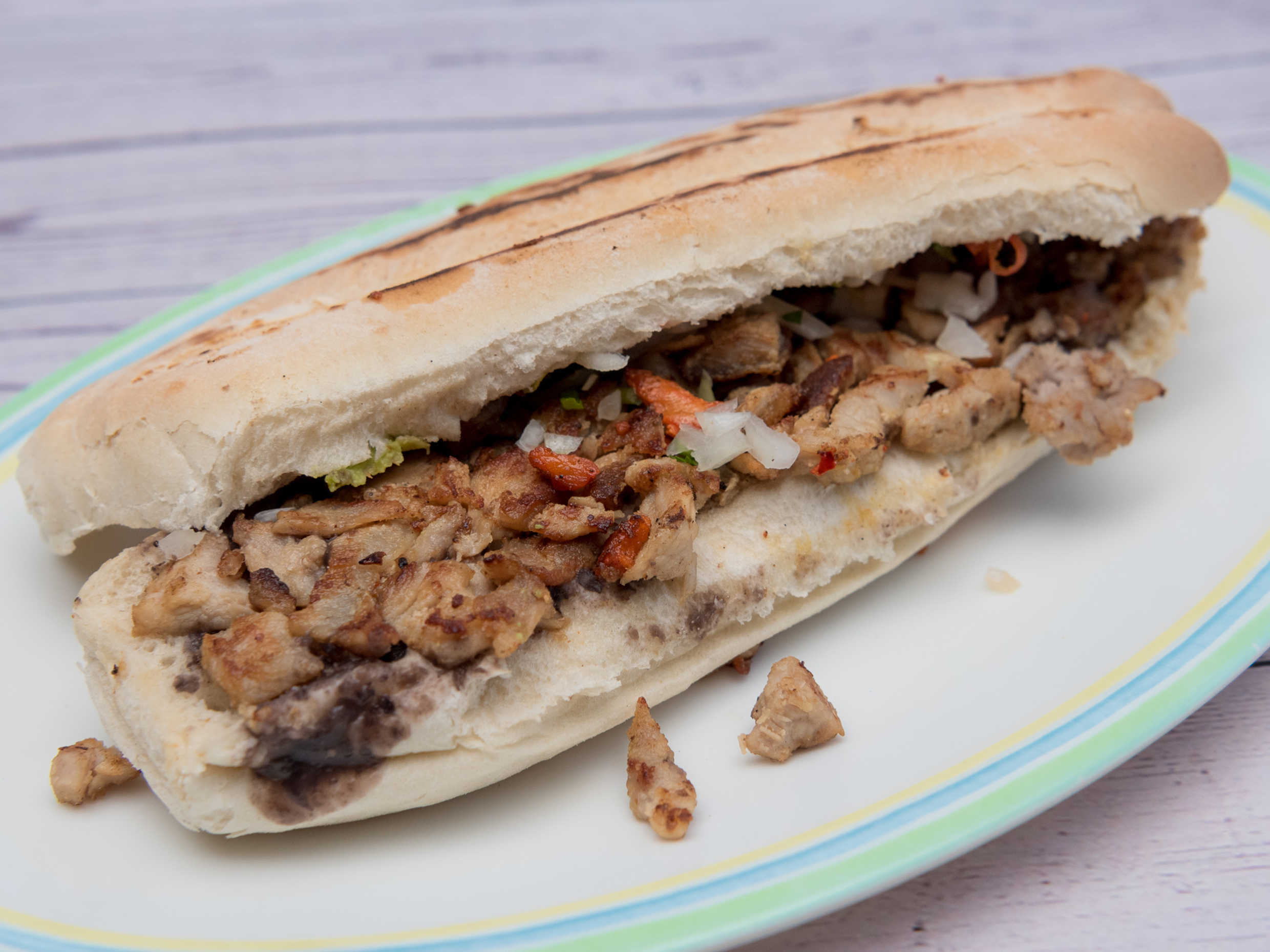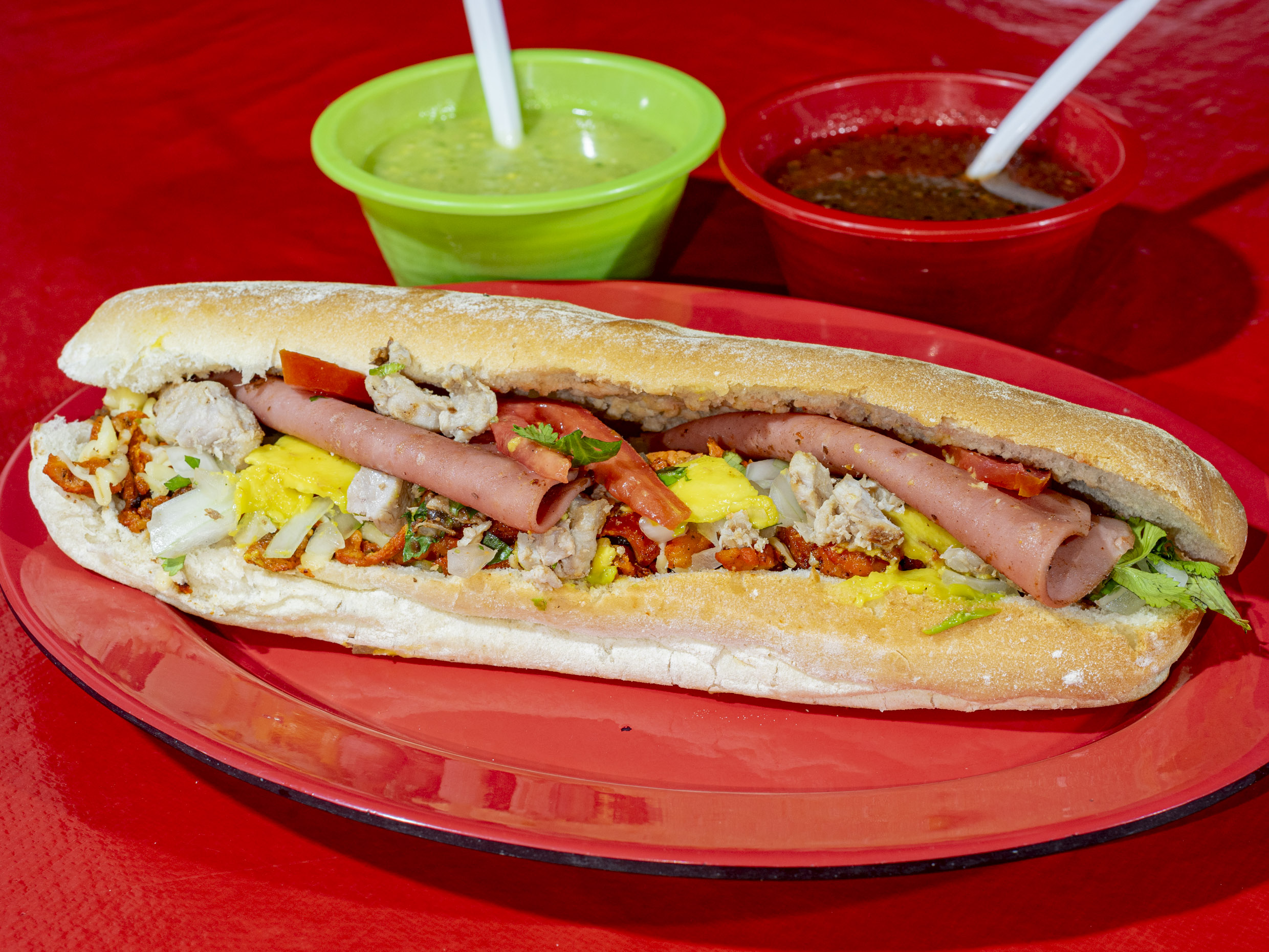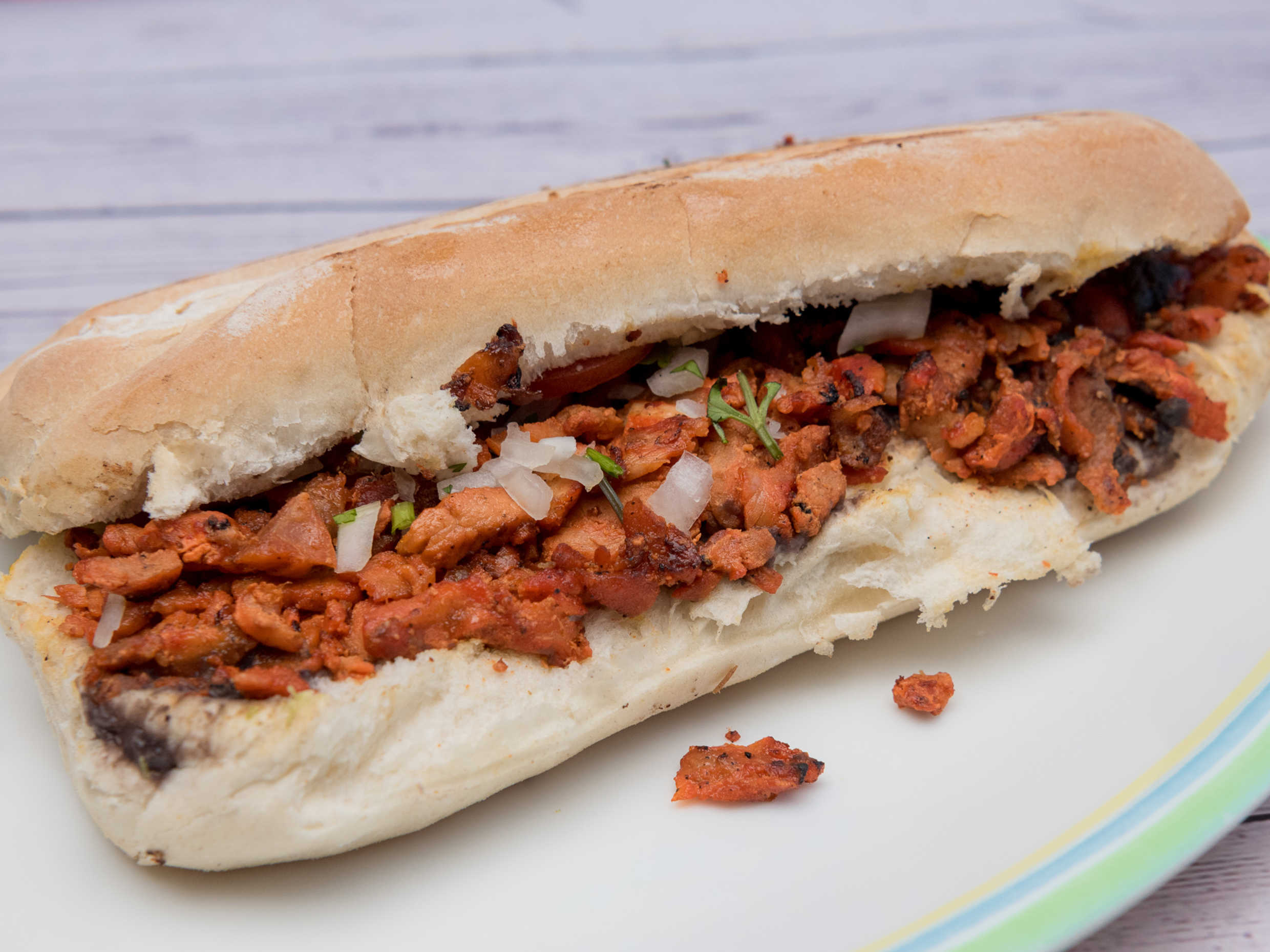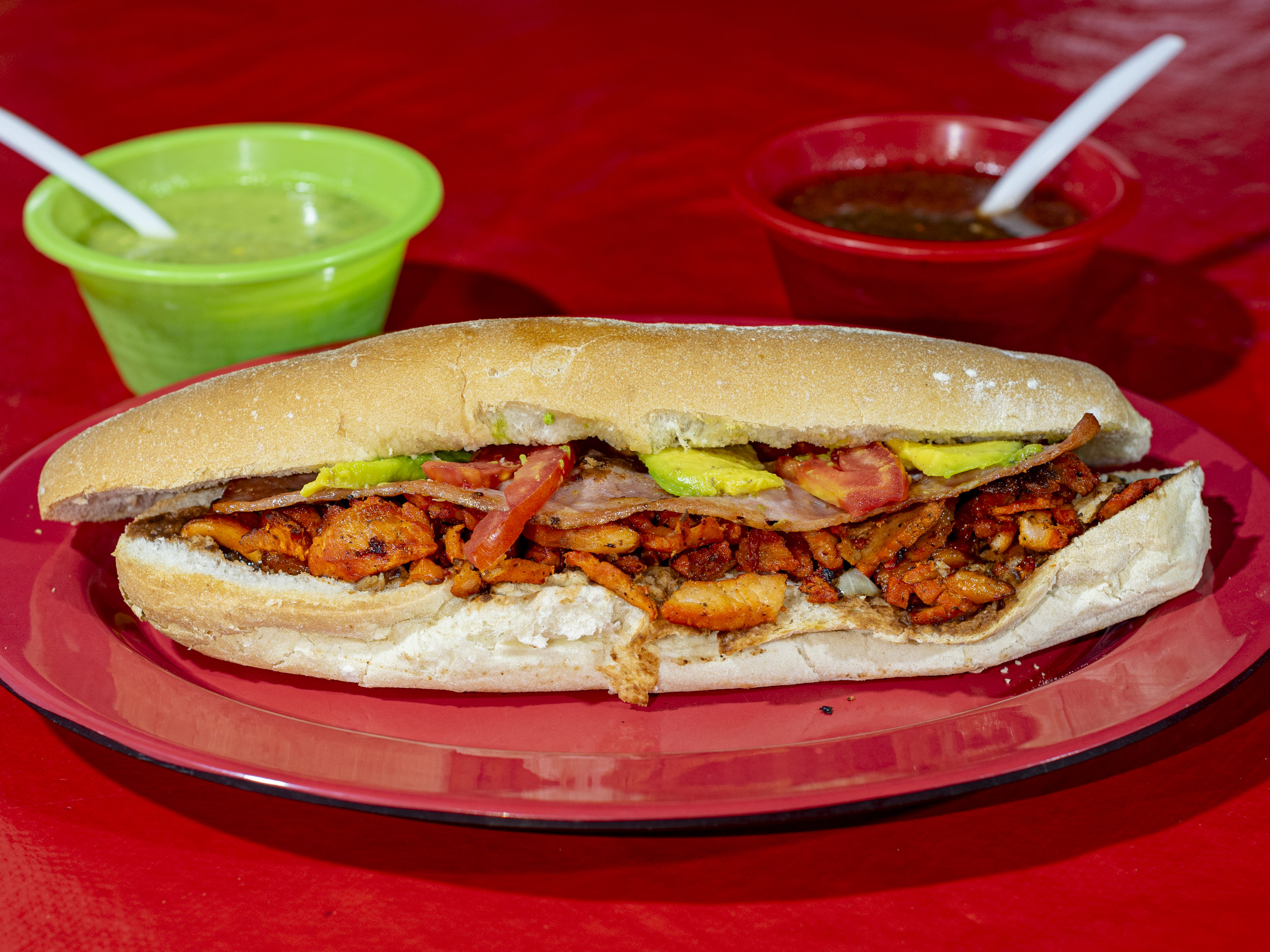 Carne al pastor, jamón, queso,frijol,jitomate, aguacate, cebolla/cilantro
