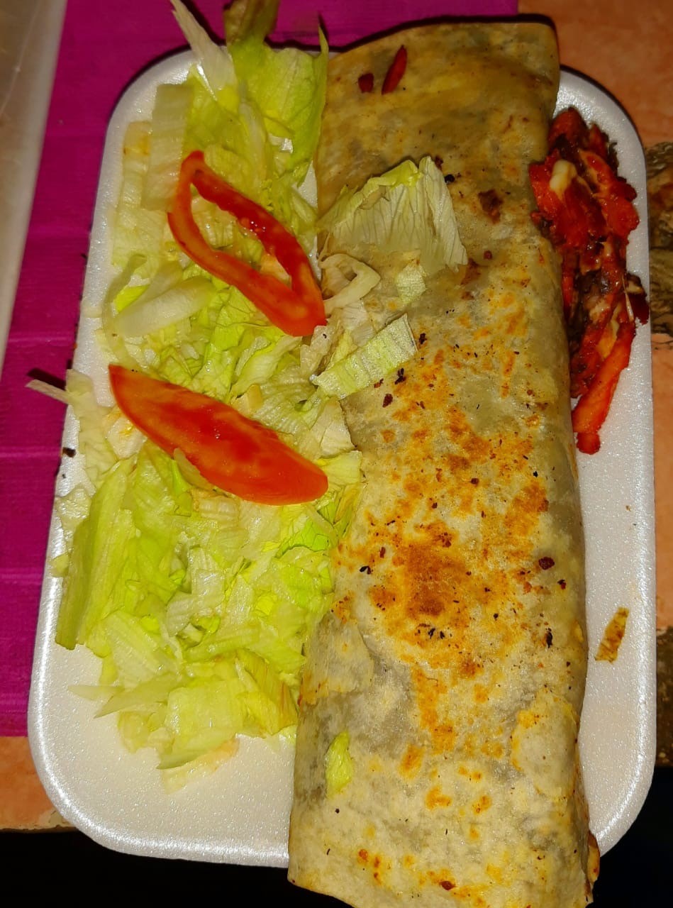 Tortillon de harina , frijol,queso, carne al pastor,romanita,crema, queso sopero
