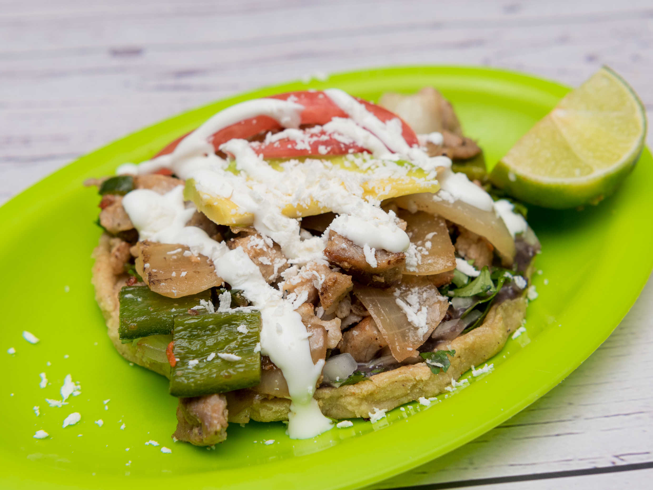Carne al pastor, frijol,,romanista, crema, queso sopero, aguacate, jitomate