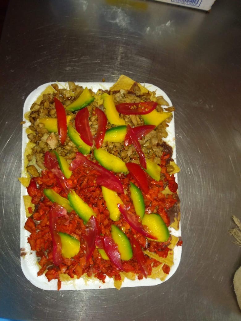Totopos,frijol,carne al pastor, queso, cebolla,, cilantro, aguacate
