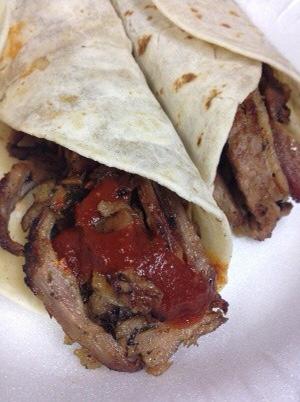 Tortilla de harina acompañado de carne al pastor romana y un poco de guacamole con tostada.