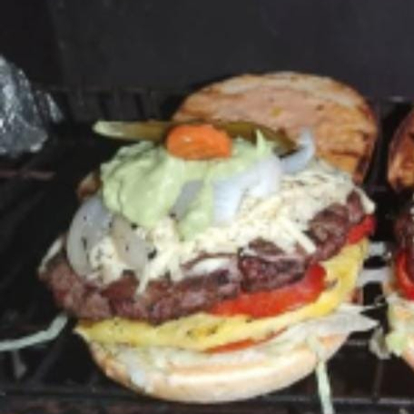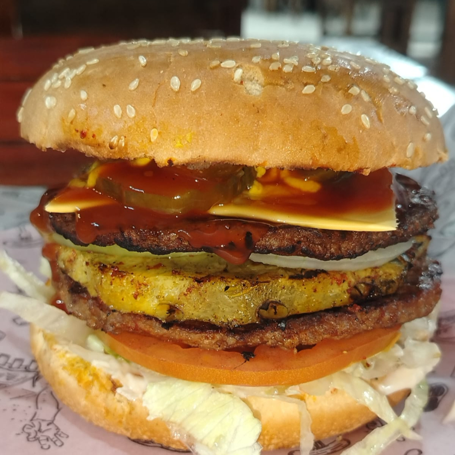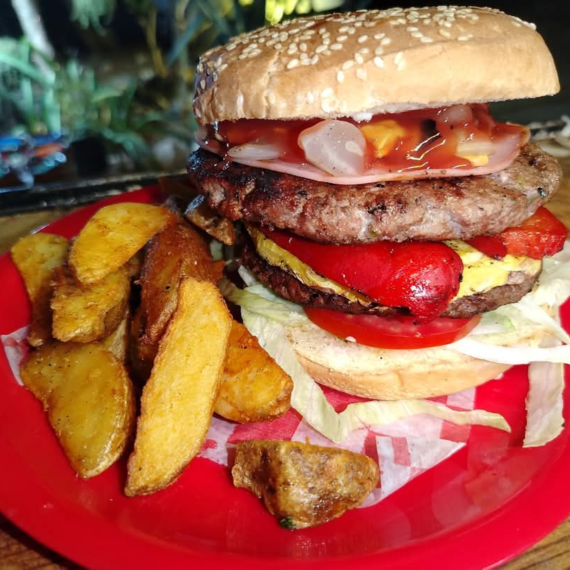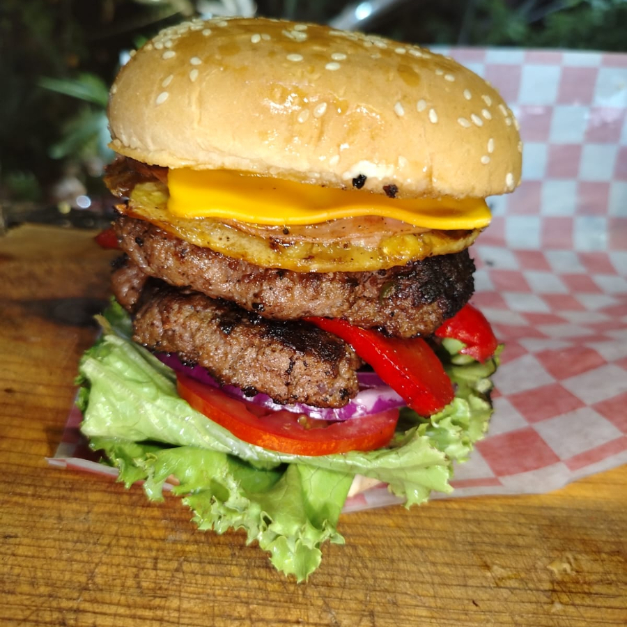 Doble carne, Jamón, Queso americano, tomate, cebolla, lechuga, pepinillos