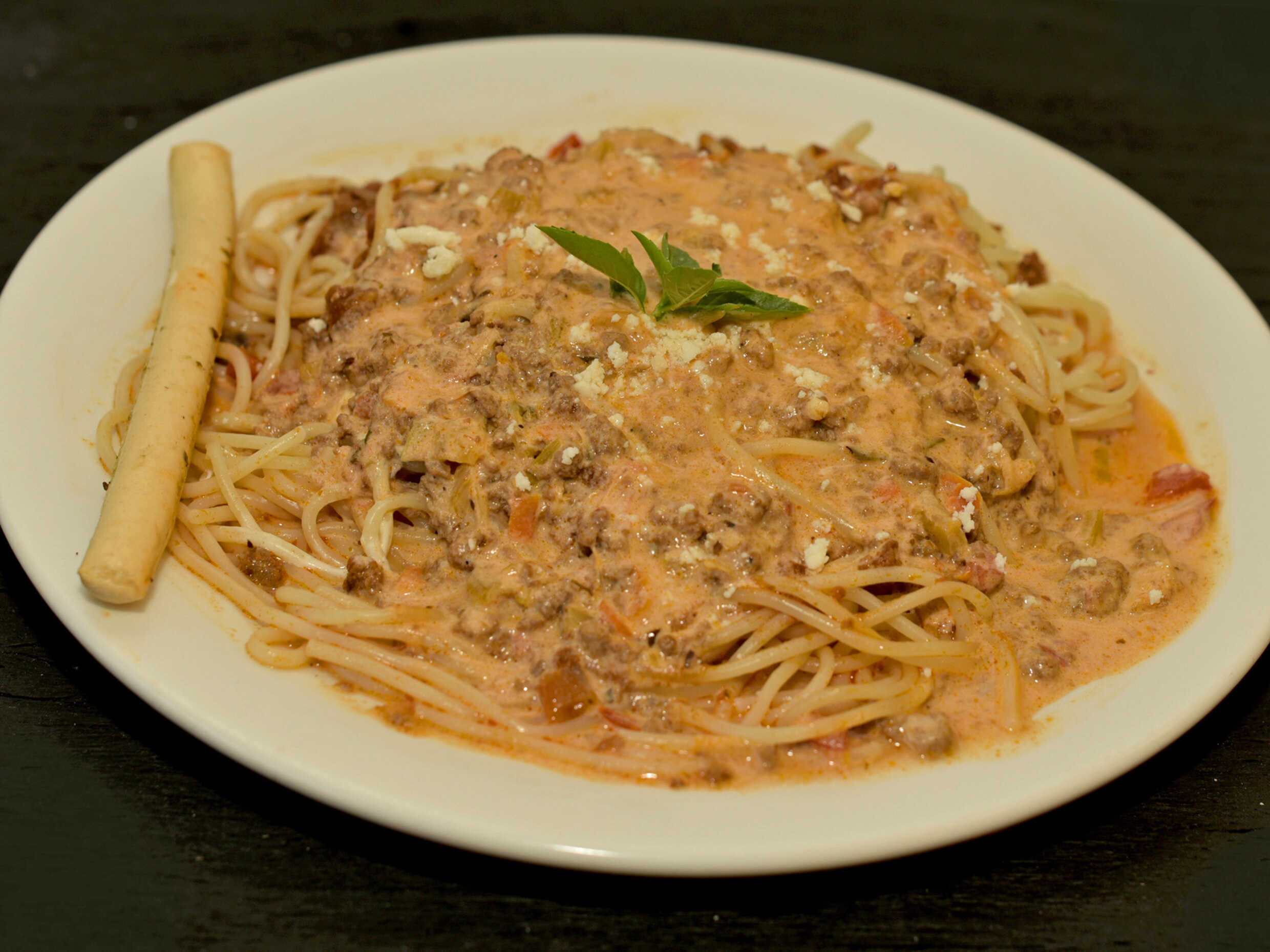 Spaguetti en salsa cremosa Rosa combinación de salsa bolognesa salsa Alfredo queso parmesano y especies