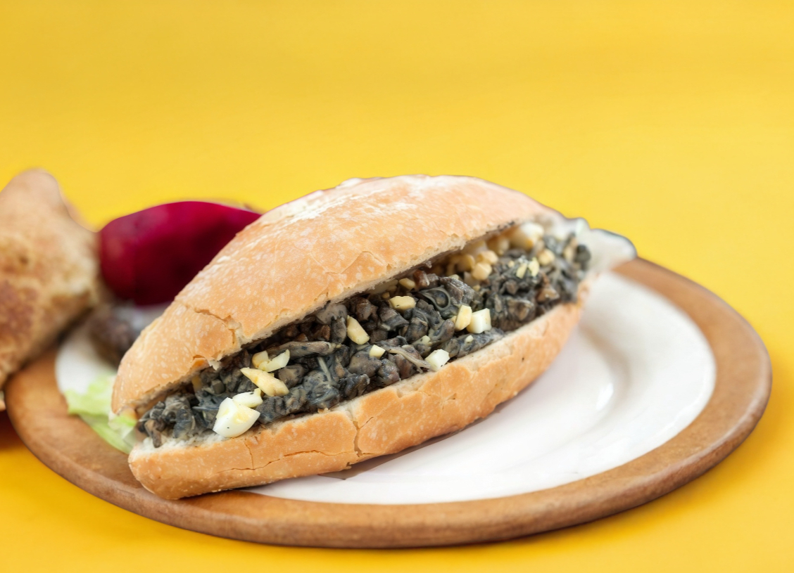 Rico pavo condimentado de relleno negro, hecho a base de caldo de pavo, acompañado de huevo, típico regional.